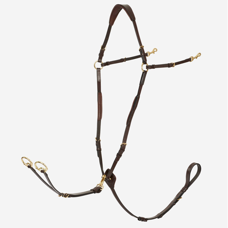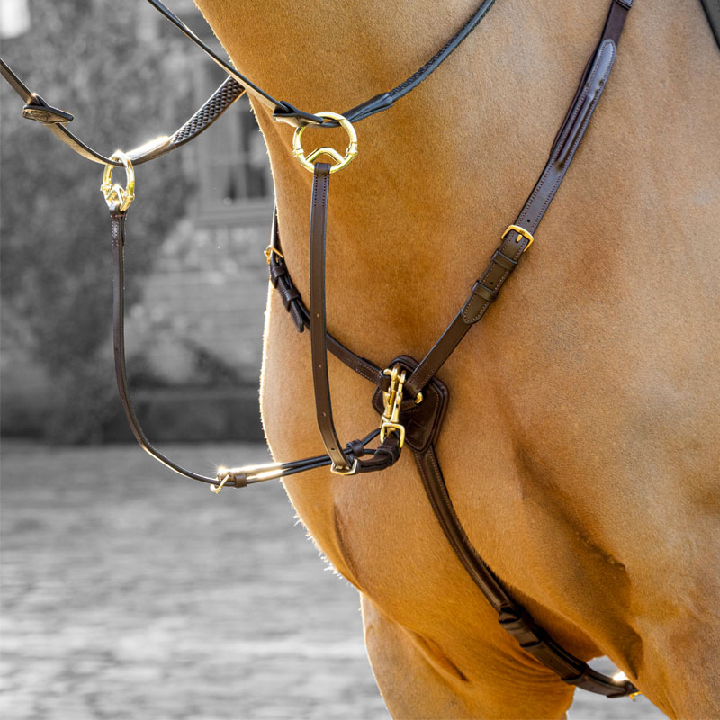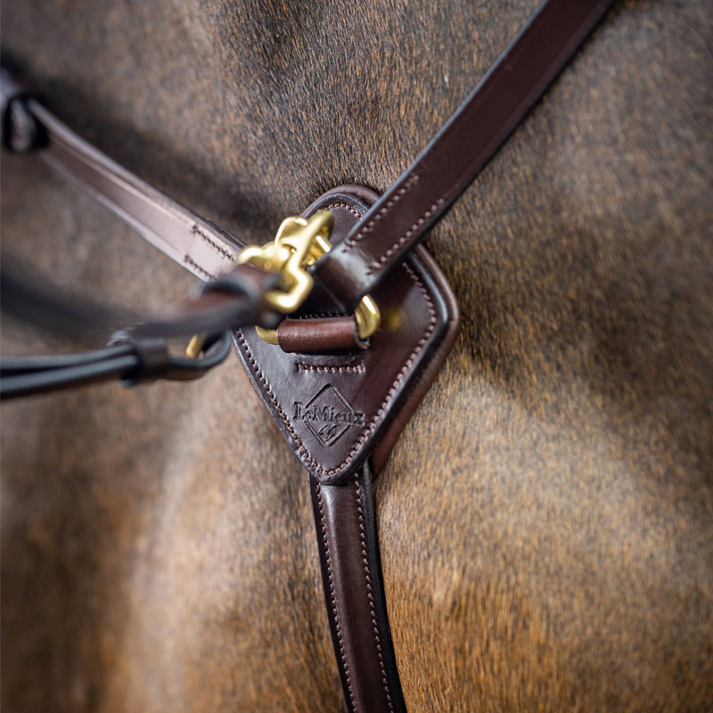Het LeMieux Voortuig Kudos Havana/Brass is gemaakt uit zacht Europees kwaliteit leer en is zacht gewatteerd op het bovenstuk bij de schoft, op de borst en de riemen langs de hals waardoor kale plekken worden voorkomen. Het voortuig is op alle mogelijke plaatsen verstelbaar waardoor een optimale pasvorm kan worden gegarandeerd. De ringen aan de martingaalvork zijn voorzien van een speciaal systeem zodat deze gemakkelijk over de teugels gedaan kunnen worden zonder de gehele teugel door de martingaal ringen heen te halen. Afgewerkt in combinatie met messingkleurige (goud) fournituren.