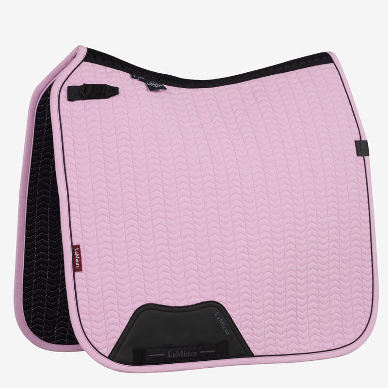 LeMieux Zadeldek Essence Fondant. Anatomisch gevormd, dun gewatteerd dekje met een zacht materiaal aan de bovenzijde en een zachte bies rondom. Het dekje heeft een zelfkoelende 3D carbon mesh rugnaad in combinatie met een hoge schoftvrijheid en is uitgevoerd met een PU lederen versteviging achter de singellussen om slijtage te verkomen.