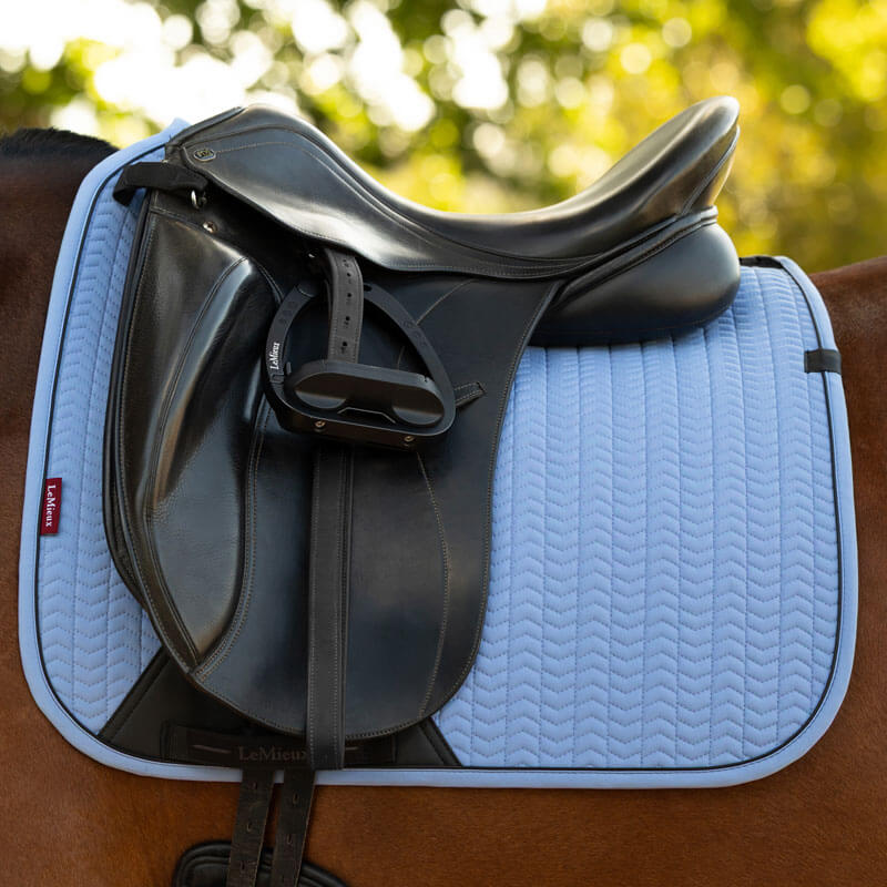 LeMieux Zadeldek Essence Powder Blue. Anatomisch gevormd, dun gewatteerd dekje met een zacht materiaal aan de bovenzijde en een zachte bies rondom voor de gevoelige paarden. Het dekje heeft een zelfkoelende 3D carbon mesh rugnaad in combinatie met een hoge schoftvrijheid en is uitgevoerd met een PU lederen versteviging achter de singellussen om slijtage te verkomen.