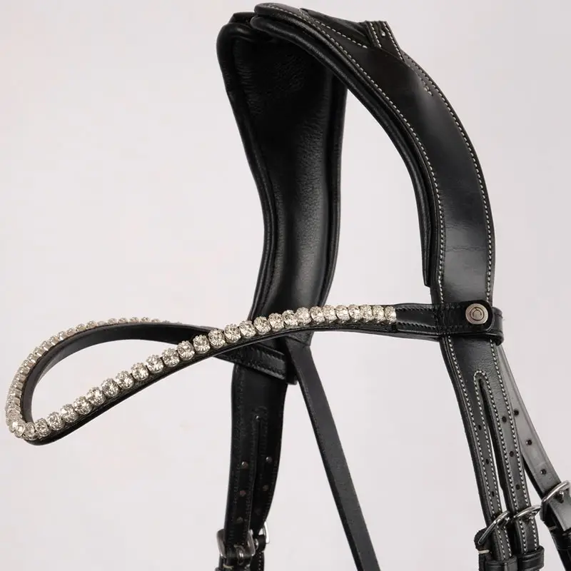 Montar frontriem Fair Helder Crystal met druksluitingen aan het uiteinde. Deze zwart lederen frontriem is verkrijgbaar in verschillende kleuren en maten.