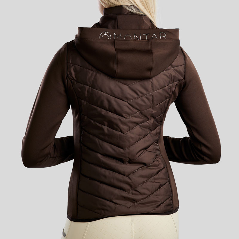 Montar Hybrid Jas MoEliza Bruin. Licht gewatteerd dames jasje uit de Montar collectie vervaardigd uit materiaalmix. Het jasje is voorzien van een opstaande kraag met afritsbare capuchon, tweeweg ritssluiting en zakken met ritssluitingen. Afgewerkt met Montar logo op de linker mouw.
