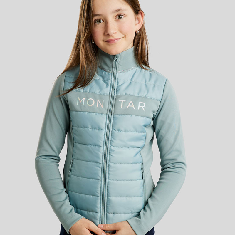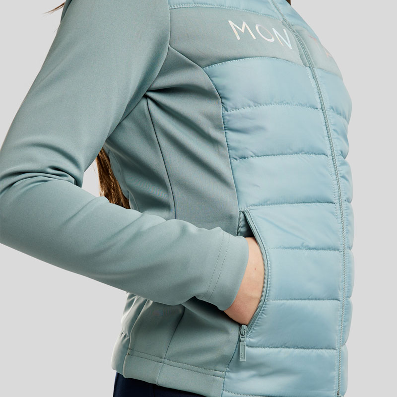 Montar Jas MoCha Kids Stone Blue vervaardigd uit wind en waterafstotende stof. De jas is gewatteerd op de voor en achterzijde in combinatie met softshell materiaal op de mouwen. De jas is voorzien van zakken met ritssluitingen en groot horizontaal Montar logo op de voorzijde in Hologram effect.
