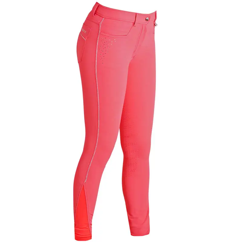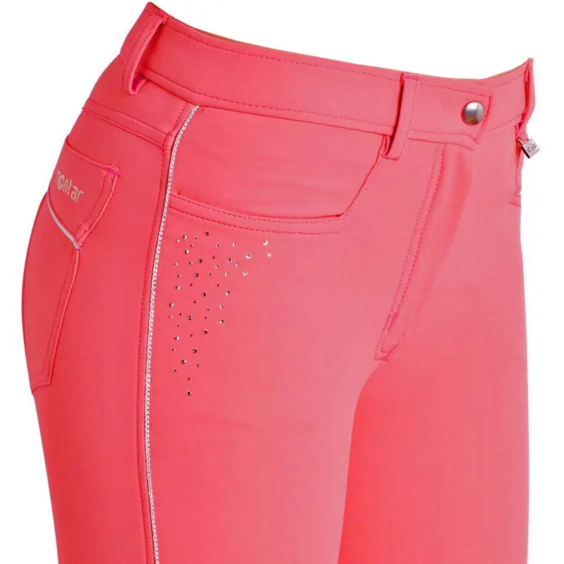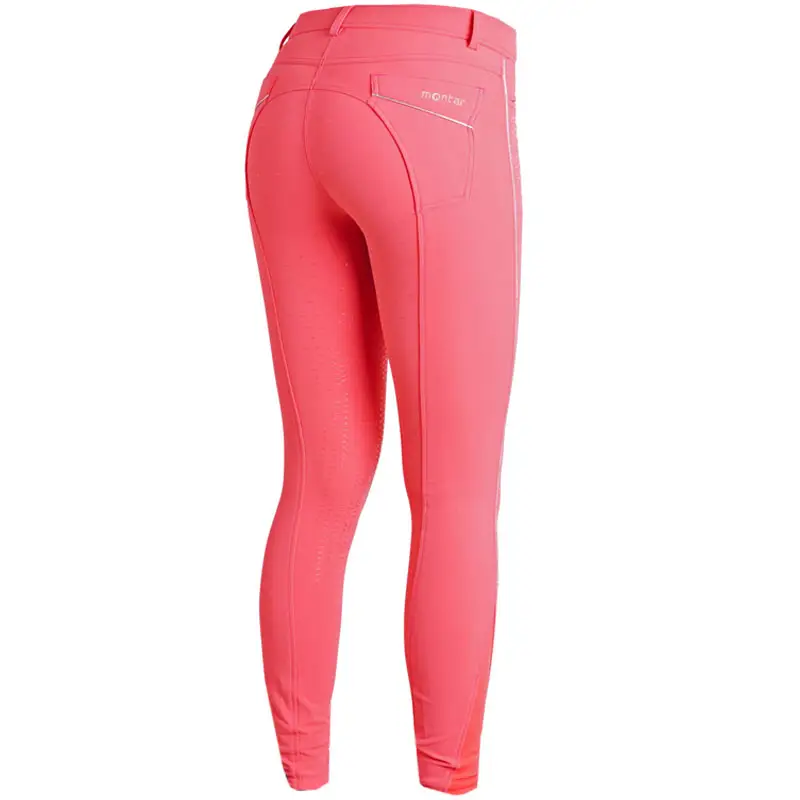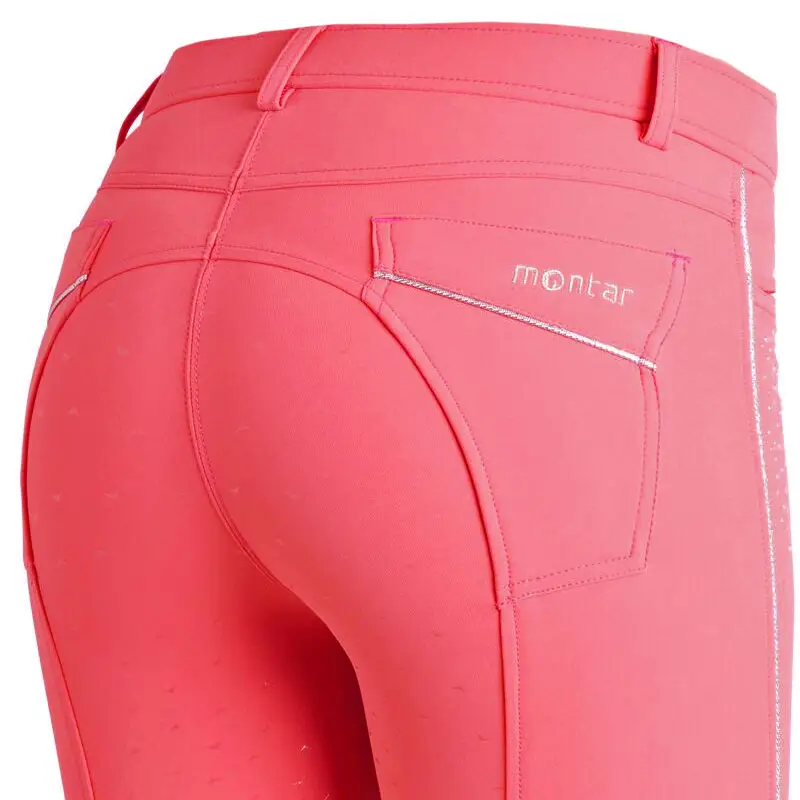 Dunne, vierweg elastische en zeer comfortabele dames rijbroek van het merk Montar met een Full Grip siliconen zitvlak en elastisch gedeelte bij de enkels. De stof waar deze rijbroek van is vervaardigd heeft een exclusieve look en is tevens waterafstotend en vochtregulerend. De rijbroek is afgewerkt met shiny piping over de volledige lengte van de benen en over de decoratieve achterzakken. Onder de jeanspockets aan de voorzijde is de rijbroek afgewerkt met strass steentjes.