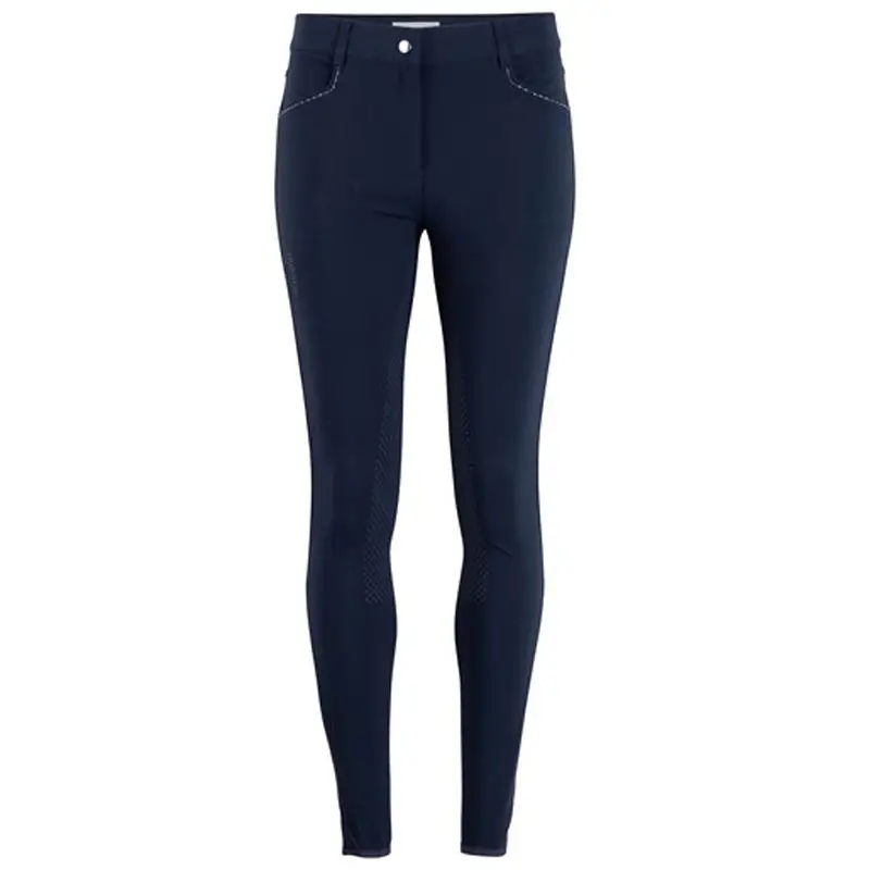 Modieuze kinder rijbroek van het merk Montar met een Full Grip zitvlak en elastisch gedeelte bij de enkels. De rijbroek is vervaardigd uit een comfortabele, elastische stof en is voorzien van jeanspockets aan de voor- en achterzijde afgewerkt met glinsterend Lurex garen en strass steentjes.
