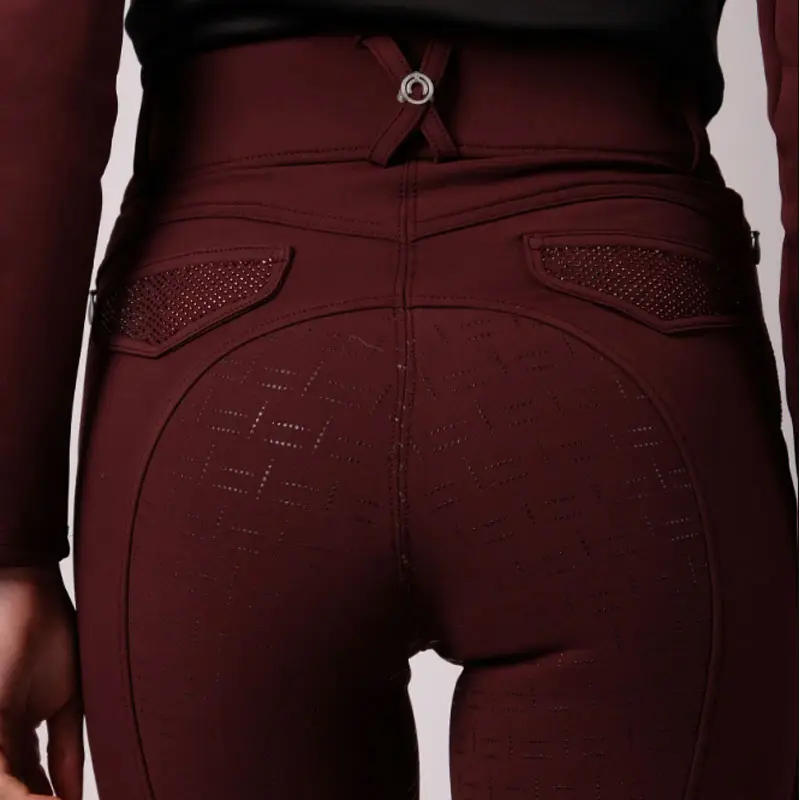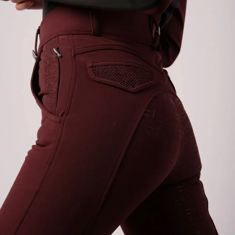 Montar rijbroek Brielle Plum. Dames rijbroek gemaakt uit hoogwaardige elastische kwaliteit Yati stof met water en vuilafstotende eigenschappen. De rijbroek is voorzien van hoge band in combinatie met Full Grip siliconen zitvlak en elastisch gedeelte bij de enkels. De decoratieve klepzakjes aan de achterzijde en de zakken aan de voorzijde zijn afgewerkt met subtiele crystal steentjes.