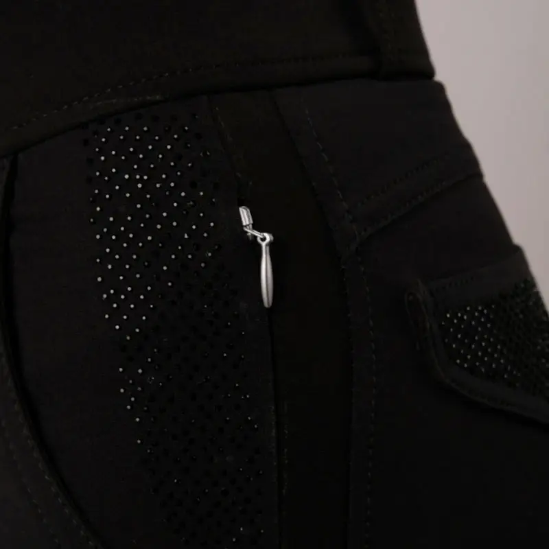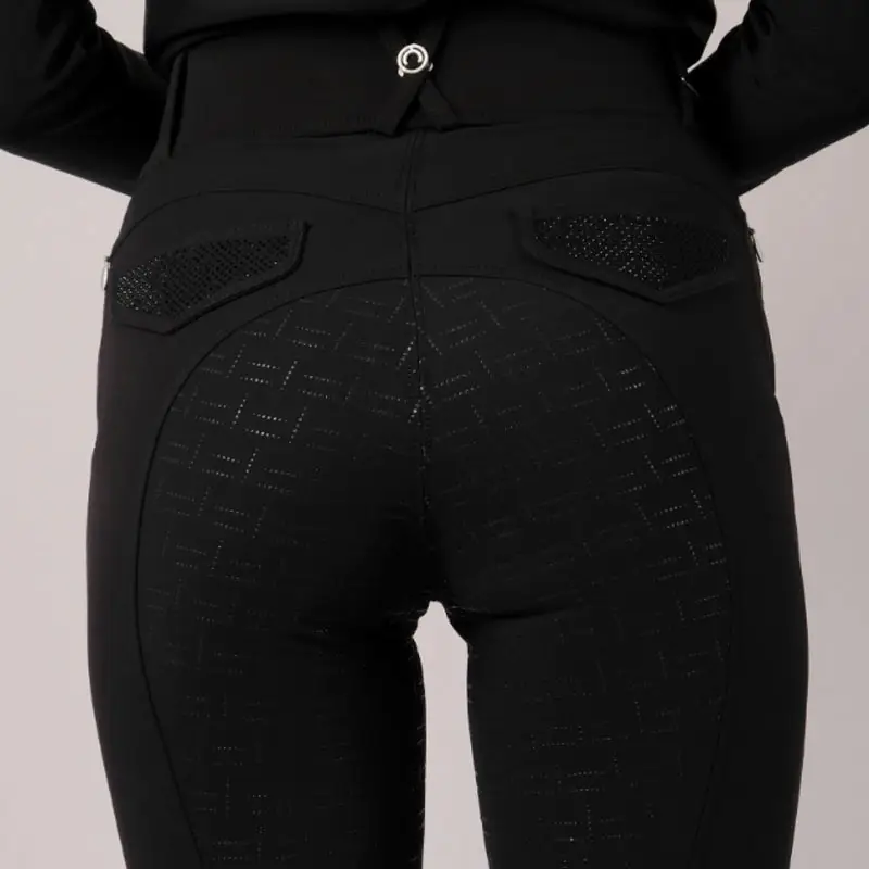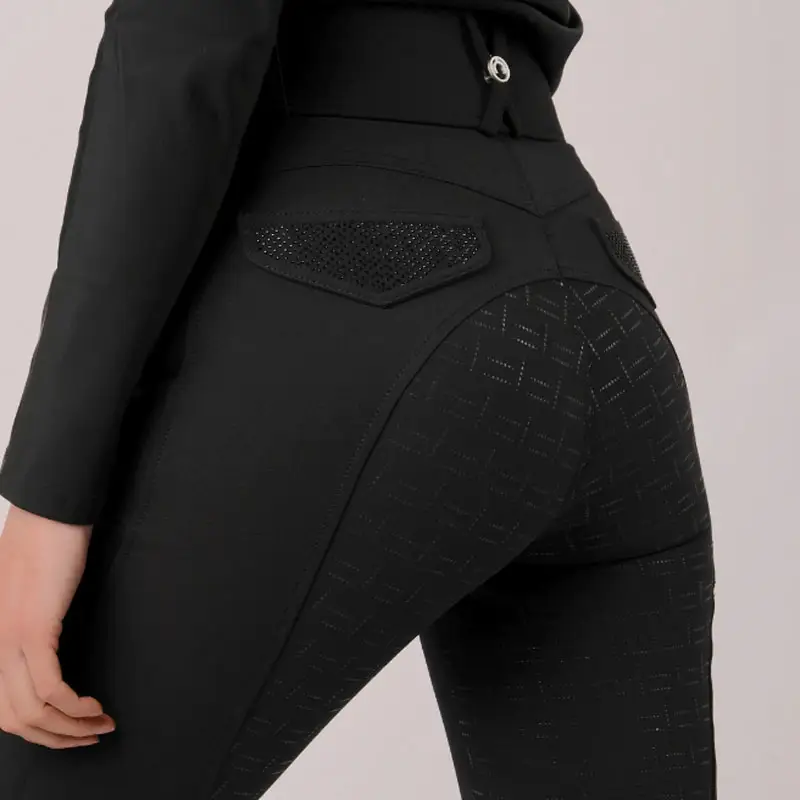 Montar Brielle High Waist. Dames rijbroek gemaakt uit hoogwaardige elastische kwaliteit Yati stof met water en vuilafstotende eigenschappen. De rijbroek is voorzien van hoge band in combinatie met Full Grip siliconen zitvlak en elastisch gedeelte bij de enkels. De decoratieve klepzakjes aan de achterzijde en de zakken aan de voorzijde zijn afgewerkt met subtiele crystal steentjes.