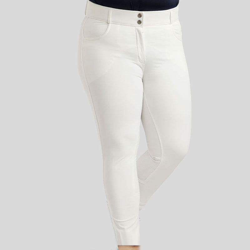 Montar Rijbroek Megan Full Grip Curve Wit. Wedstrijdbroek voor dames met een maatje meer. De rijbroek wordt geproduceerd in de dames maten 48 tot en met 54.