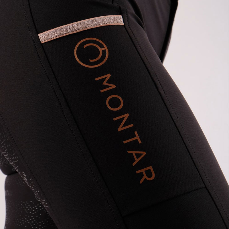 Luxe Montar rijbroek Millie zwart/rosegoud voor kinderen. De rijbroek is gemaakt uit een vuil en waterafstotende Yati stof met vochtregulerende eigenschappen en heeft een elastische verstelbare tailleband. De rijbroek is voorzien van een siliconen Grip zitvlak, twee mobiele telefoonzakken en is afgewerkt met Rosegoude details en logo op het been.