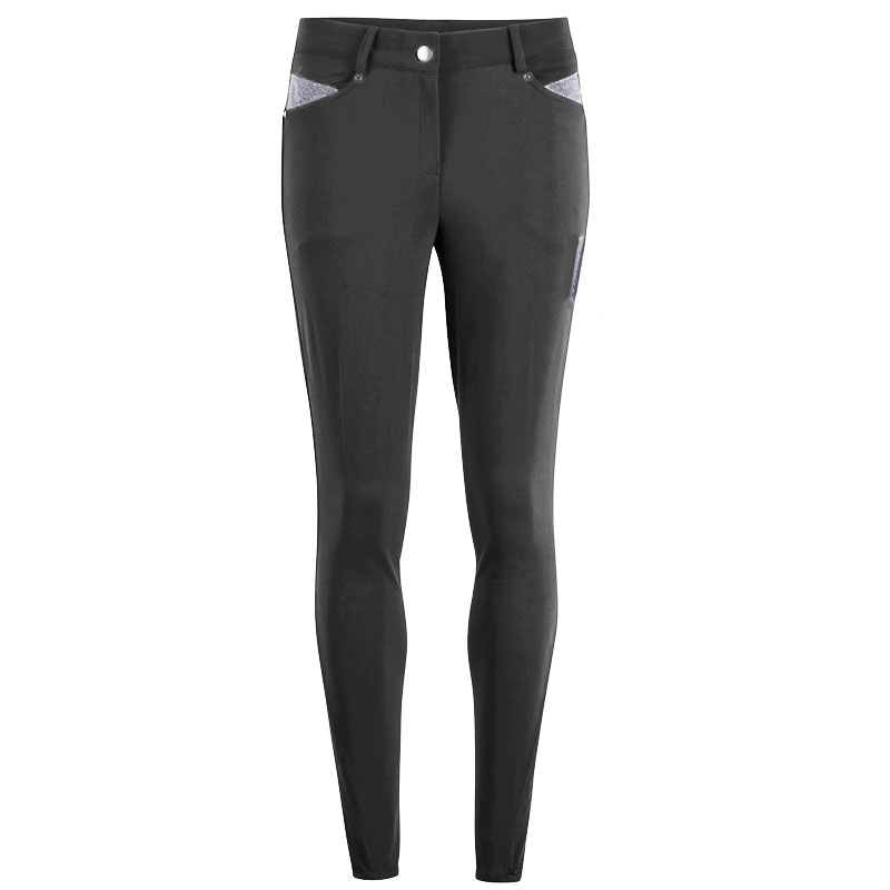 Dames rijbroek van het merk Montar voorzien van normale tailleband met schuifsluiting en rits. De rijbroek is vervaardigd uit Soft Tech duurzaam materiaal met waterafstotende en ademende eigenschappen. De rijbroek is uitgevoerd met twee zakken op de voorzijde ingelegd met fraaie glitter details. Op het linkerbeen en op de rechter achterzijde van de tailleband is de rijbroek voorzien van het Montar logo eveneens vervaardigd uit glitter materiaal. De rijbroek heeft een Full Grip siliconen zitvlak en elastisch gedeelte bij de enkels.