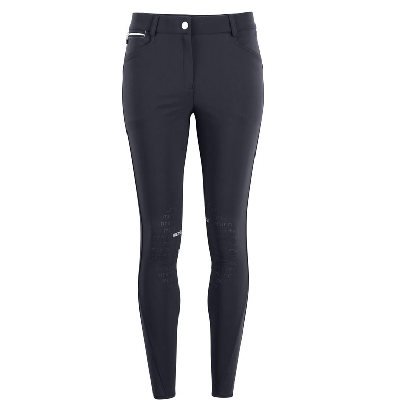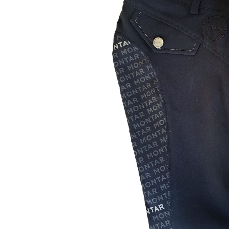 Dames rijbroek van het merk Montar voorzien van normale tailleband met schuifsluiting. De rijbroek is vervaardigd uit een technologisch duurzaam materiaal met waterbestendige en ademende eigenschappen. De rijbroek is uitgevoerd met twee schuine zakken op de voorzijde, twee decoratieve klepzakjes met druksluitingen op de achterzijde en heeft een Full Grip siliconen zitvlak en elastisch gedeelte bij de enkels.