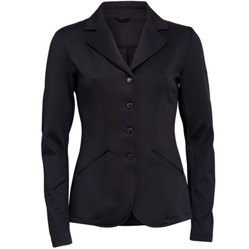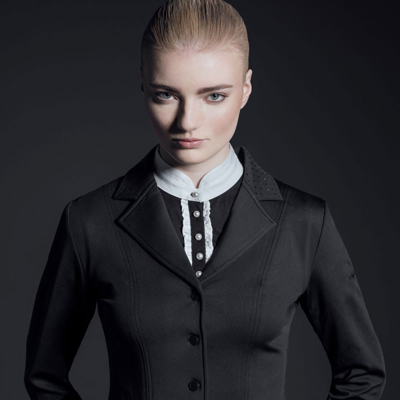 Getailleerde dames wedstrijas vervaardigd uit softshell van het merk Montar. Het rijjasje is voorzien van zwartkleurige knoopsluitingen, twee schuine zakken met ritssluitingen en een afwerking met zwarte crystal steentjes op de kraag en op de rug.