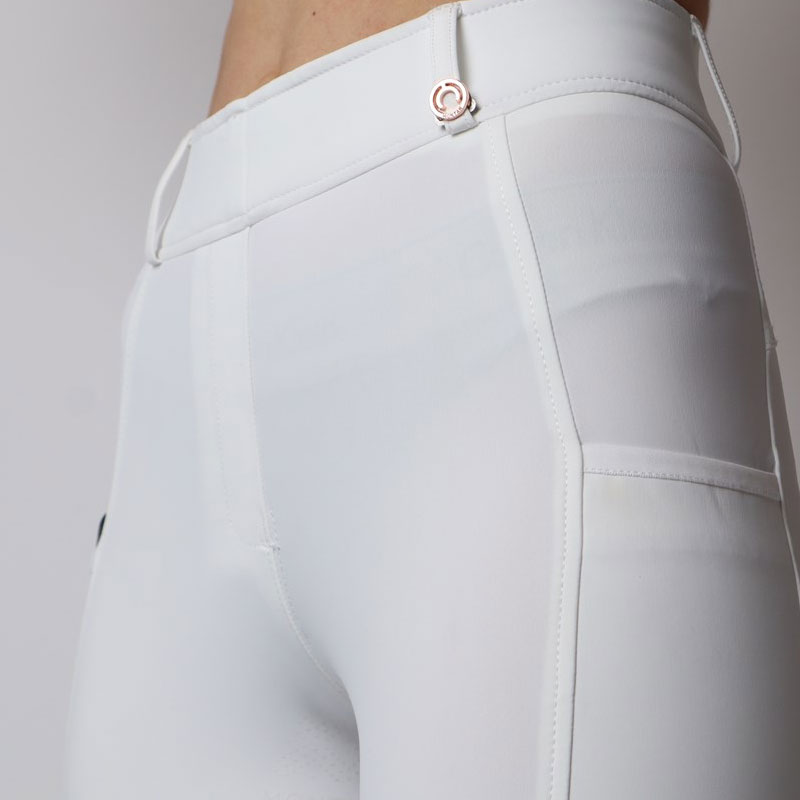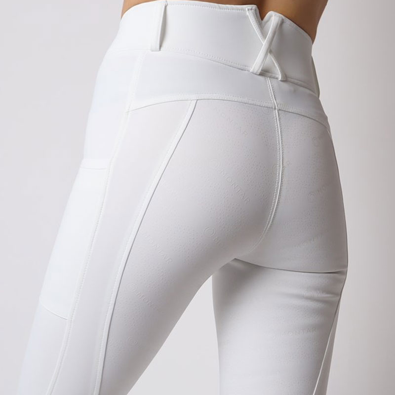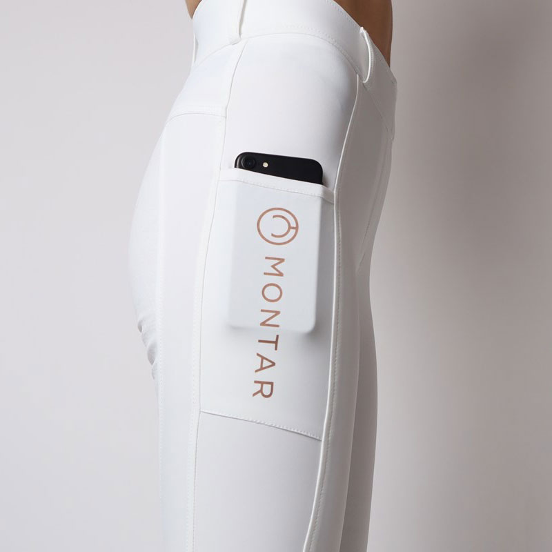 De Montar rijlegging Michelle wit/rosegoud is een comfortabele dames rijlegging voorzien van een hoog aansluitende band. De rijlegging is gemaakt van een wat dikkere, zacht aanvoelende stof en heeft een Full Grip siliconen zitvlak en een mobiele telefoonzak op beide benen. De legging is afgewerkt met Rosegoud label en een Montar logo in Rosegoud op het been.