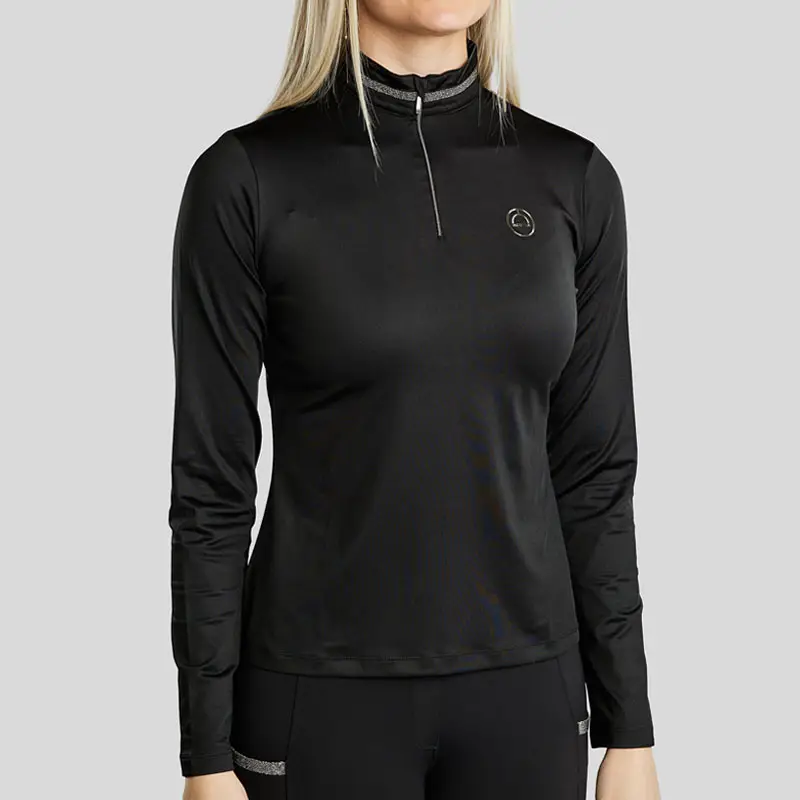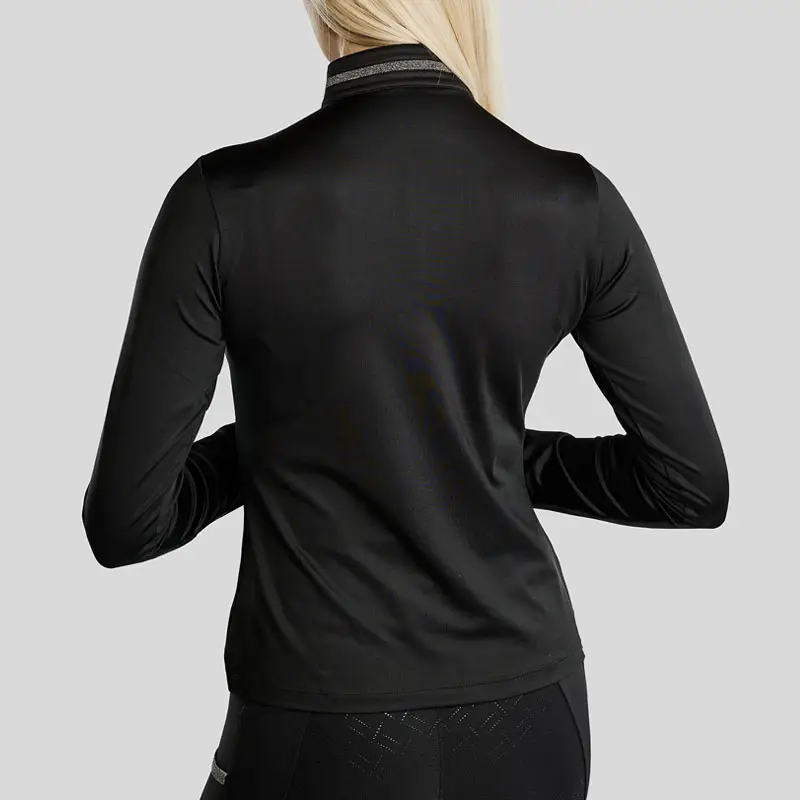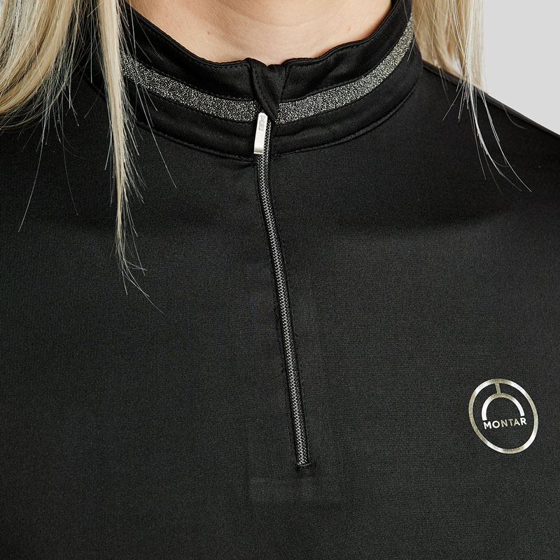 Montar Thermo Longsleeve MoGaia Zwart. Modieus met geborsteld fleece gevoerd dames shirt met lange mouwen in combinatie met opstaand kraagje en rits. Het shirt is vervaardigd uit Mon-Tech vochtregulerende en ademende stof en is afgewerkt met glitter band rondom de kraag.