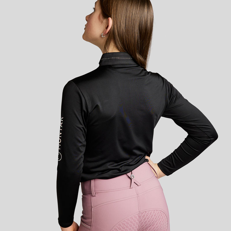 Montar Trainingsshirt MoCha Kids Zwart. Paardrijshirt voor kinderen voorzien van opstaand boordje met korte rits, Crystal steentjes in Hologram effect rondom de kraag, logo op de borst en Montar logo op de linker mouw in Hologram effect. Het shirt heeft lange mouwen en is vervaardigd uit een comfortabele elastische stof.