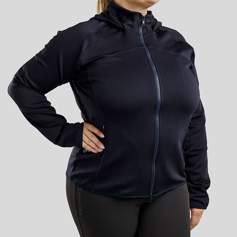 Montar Vest Liza Curve Dark Navy. Comfortabel paardrijvest voorzien van afneembare capuchon voor dames met een maatje meer.