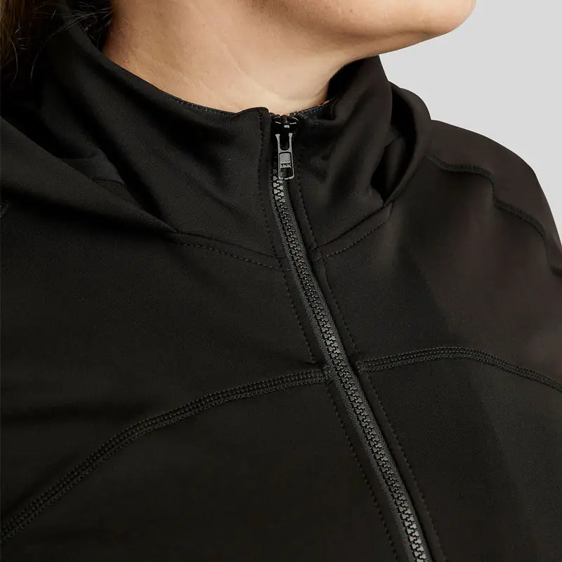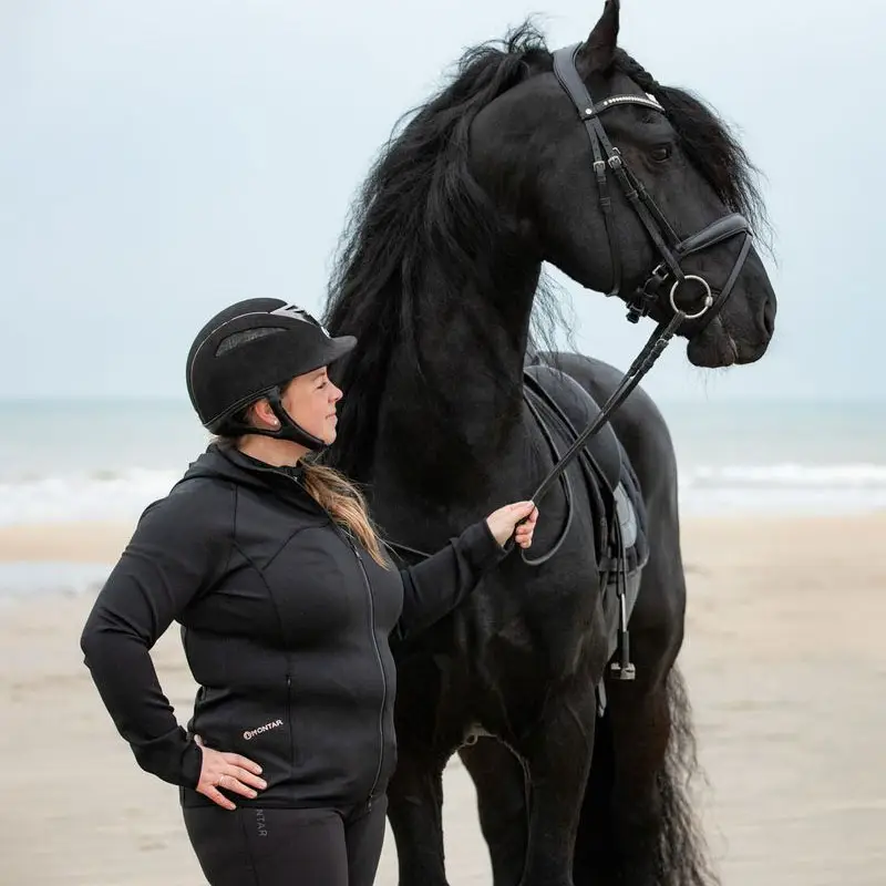 Montar Vest Liza Curve Zwart. Comfortabel paardrijvest voorzien van afneembare capuchon voor dames met een maatje meer.