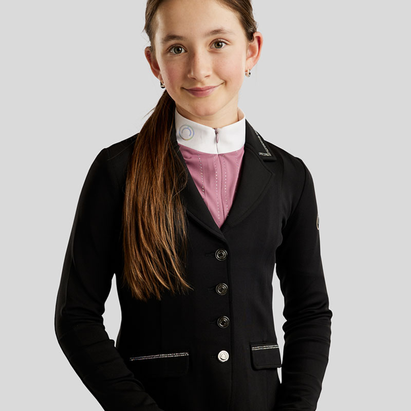 Montar wedstrijdjas MoCha Kids Zwart. Opvallend kinder rijjasje uit de Montar collectie met decoratieve klepzakjes aan de voorzijde en een dubbele split aan de achterzijde. Het rijjasje is afgewerkt met crystal details in Hologram effect langs de rand van de kraag en op de klepzakjes. De linker mouw is voorzien van het Montar logo eveneens in Hologram effect.