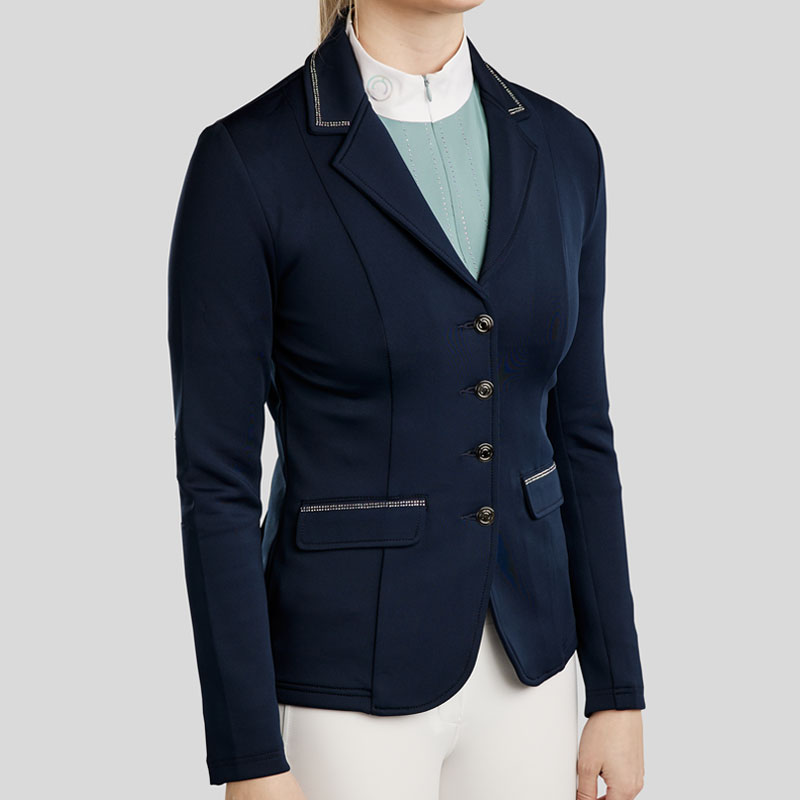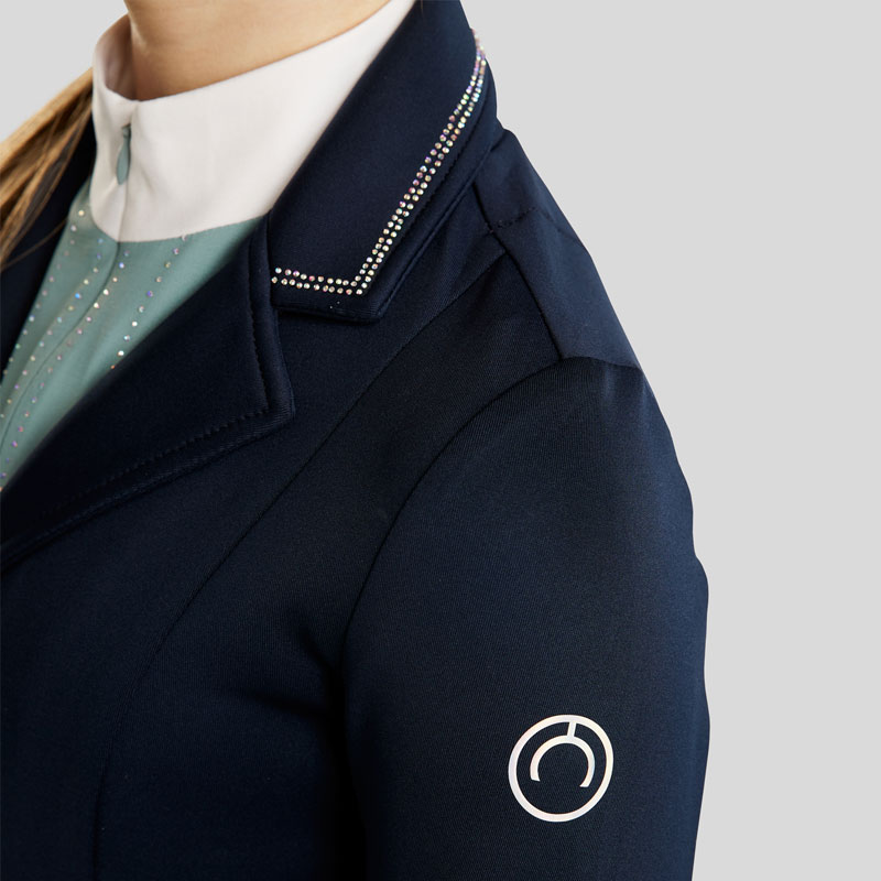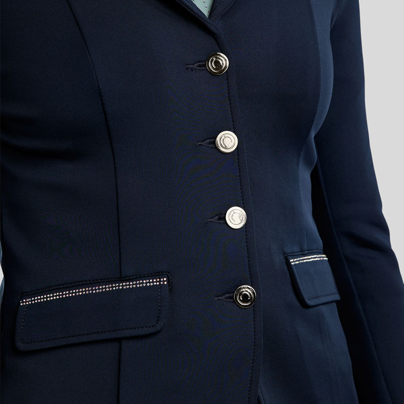 Montar wedstrijdjas MoCha Navy voor dames. Opvallend rijjasje uit de Montar collectie met decoratieve klepzakjes aan de voorzijde en een dubbele split aan de achterzijde. Het rijjasje is afgewerkt met crystal details in Hologram effect langs de rand van de kraag en op de klepzakjes. De linker mouw is voorzien van het Montar logo eveneens in Hologram effect.