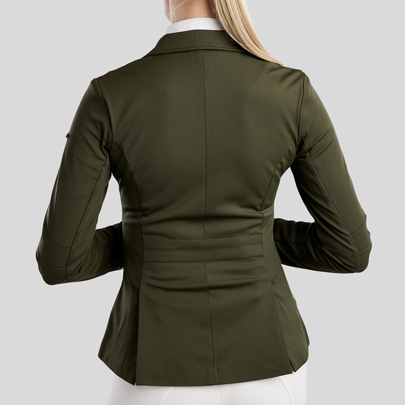 Montar Wedstrijdjas MoGloria Olijf vervaardigd uit elastische 4-weg stretch stof. Het jasje is verfraaid met glitter band langs de zakken en langs de punt boorden op de kraag. Aan de achterzijde is het rijjasje uitgevoerd met een dubbele split wat zorgt draagt voor optimale bewegingsvrijheid in het zadel.