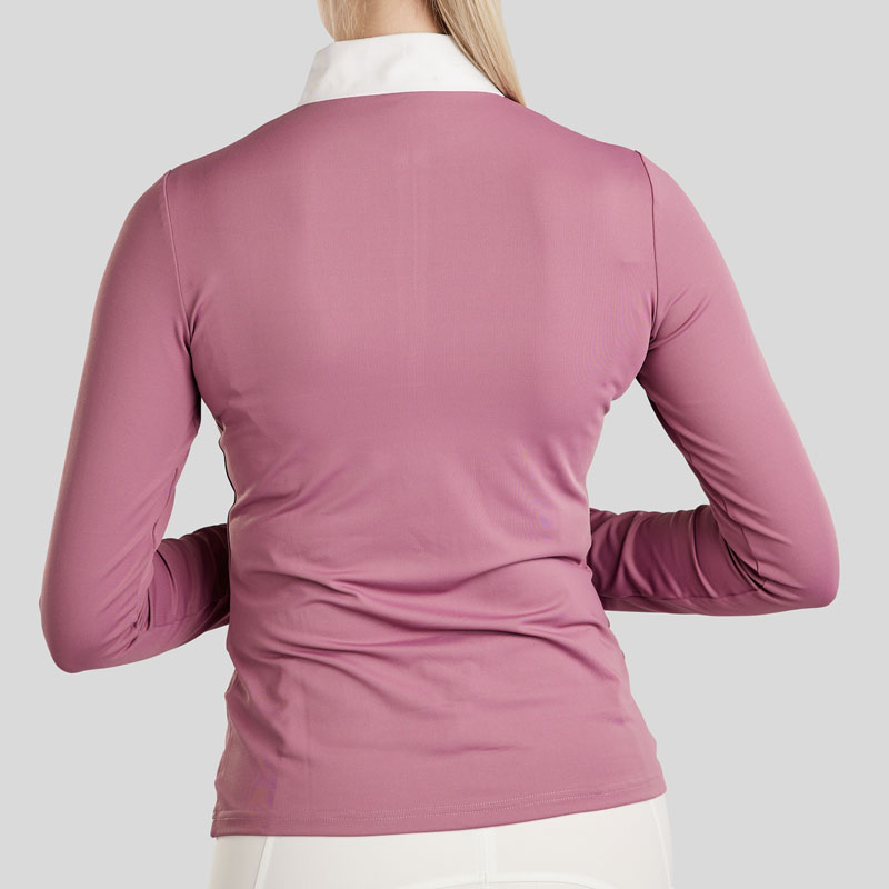 Montar Wedstrijdshirt MoCha Geranie voor dames voorzien van opstaand boordje met korte rits, Crystal details en Montar logo in Hologram effect. Het shirt is uitgevoerd met lange mouwen en is vervaardigd uit een comfortabele elastische stof.