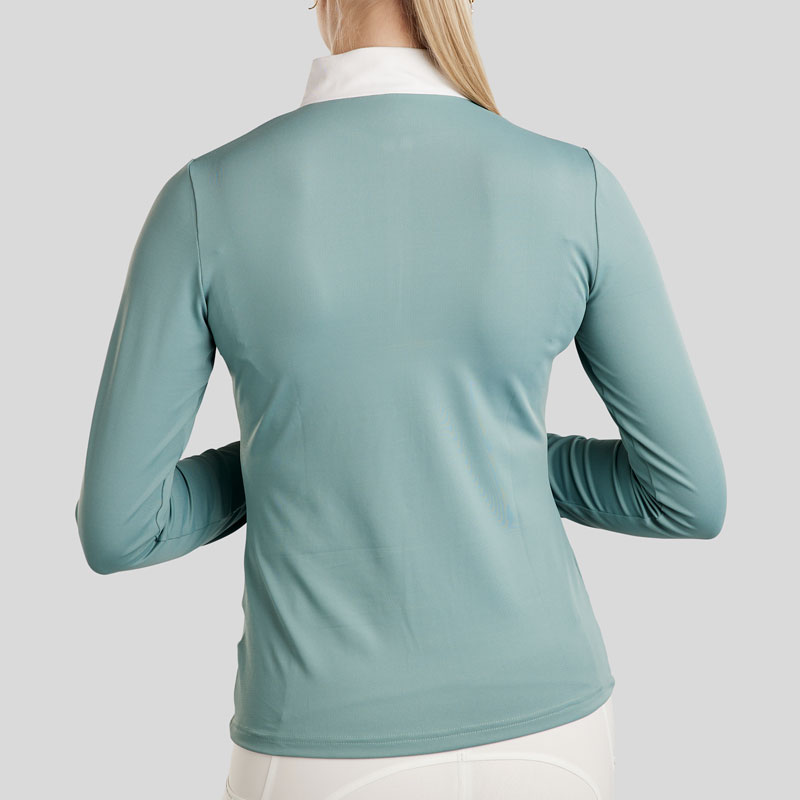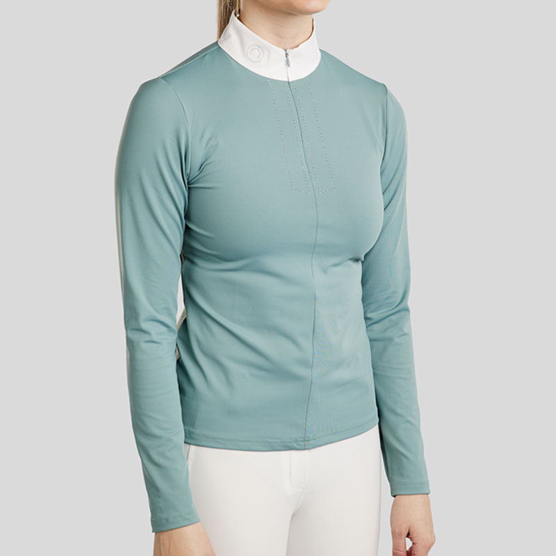 Montar Wedstrijdshirt MoCha Stone Blue voor dames voorzien van opstaand boordje met korte rits, Crystal details en Montar logo in Hologram effect. Het shirt is uitgevoerd met lange mouwen en is vervaardigd uit een comfortabele elastische stof.
