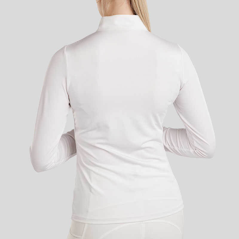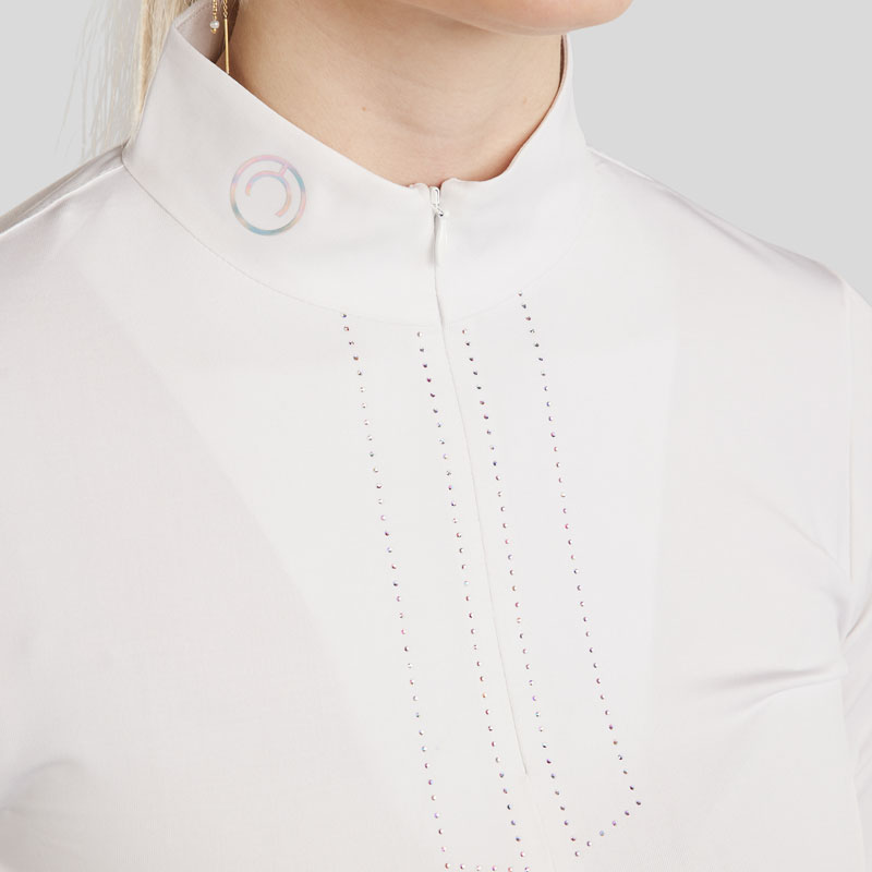 Montar Wedstrijdshirt MoCha Wit voor dames voorzien van opstaand boordje met korte rits, Crystal details en Montar logo in Hologram effect. Het shirt is uitgevoerd met lange mouwen en is vervaardigd uit een comfortabele elastische stof.