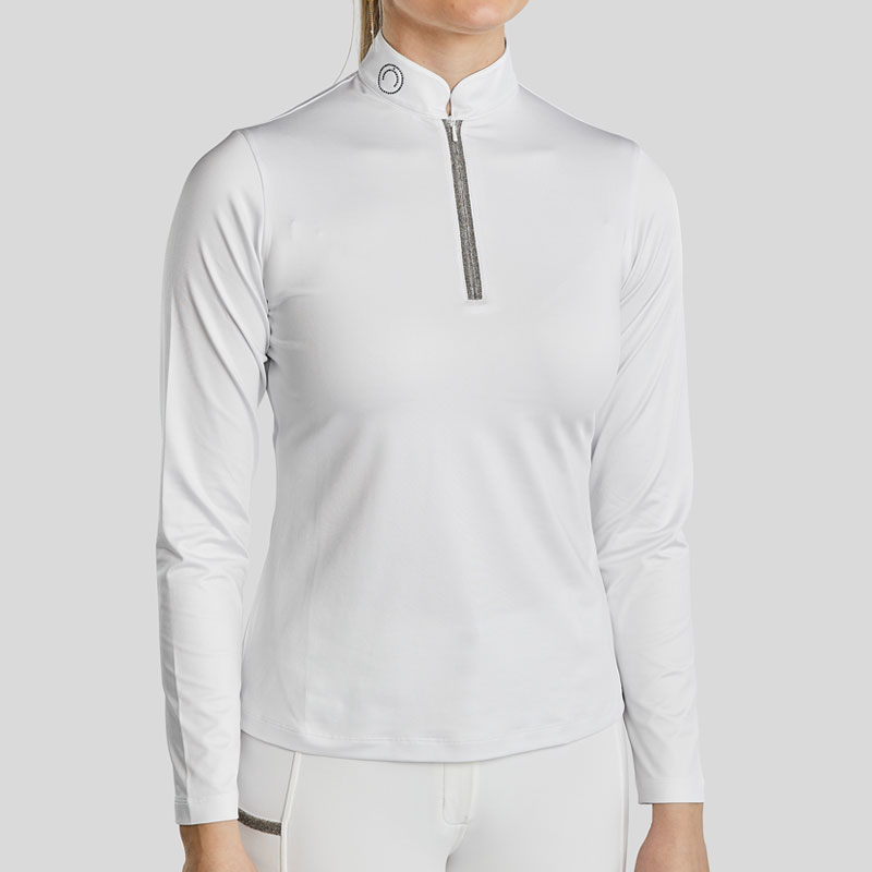 Montar Wedstrijdshirt MoGaia Wit. Dames showshirt met klein opstaand boordje in combinatie met ritssluiting afgewerkt met Montar logo uit strass en glitter band langs de rits. Het shirt heeft een hoog draagcomfort door de elastische stof.