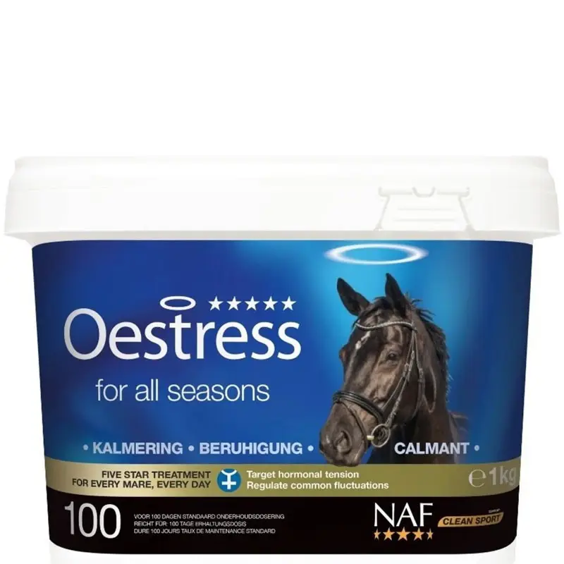 NAF Oestress 1 kg ondersteunt op natuurlijke wijze de hormonale cyclus van de merrie door zich te richten op de diepere oorzaken van het ongemak, dat zich uit in stemmingswisselingen. Merries ervaren vaak dezelfde stress van hormonale schommelingen als hengsten. Verschijnselen kunnen zijn: stemmingswisselingen, agressie, flirten, ‘lichtgeraaktheid’ en verstoorde prestaties. De positie van de eierstokken (net achter het zadel) betekent dat het ongemak vaak resulteert in een terughoudendheid om te rijden met iets op haar rug, zwiepende staart en zelfs bokken of schoppen. De unieke samenstelling van Oestress voedt de merrie met extracten van plantaardige ingrediënten, die al honderden jaren worden gebruikt om de hormoonbalans te ondersteunen. Door de hormoonspiegel op een natuurlijke wijze te ondersteunen, zal zij meer geneigd zijn om zich te ontspannen en op comfortabele wijze te concentreren op haar werk. Oestress bevat tevens biologisch magnesium ter ondersteuning bij angst en spierspanning bij merries met hormoonschommelingen. Ten slotte is Oestress rijk aan natuurlijke antioxidanten ter ondersteuning bij het verwijderen van toxines. Oestress moet dagelijks worden gevoerd in de lente en in het zomerseizoen en het rantsoen kan worden verhoogd in overeenstemming met haar oestruscyclus. Indien nodig is Oestress het jaar rond geschikt voor gebruik.