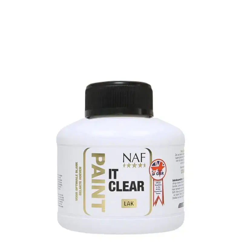Blanke lak speciaal ontworpen voor de hoeven van het paard. Het product NAF Paint It Clear ademt en is niet schadelijk voor de hoeven. Paint It Clear hoeft nadien niet van de hoeven verwijderd te worden en slijt op natuurlijke wijze.