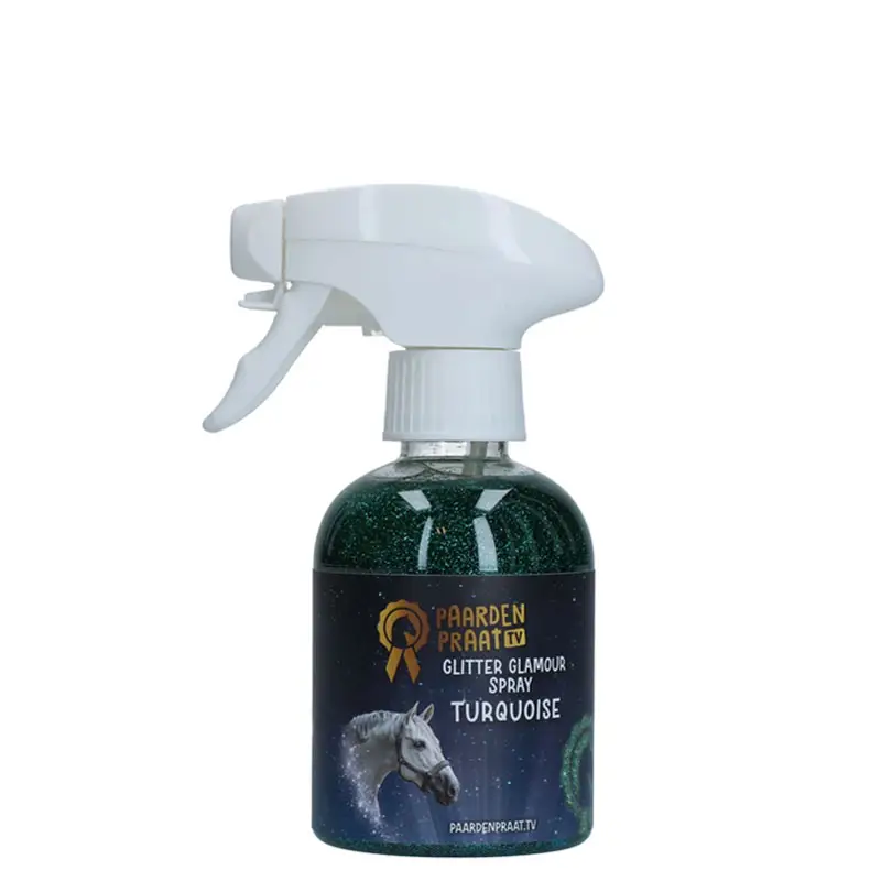 Met de Paardenpraat Glitter Glamour Spray Turquoise zorg je voor een bijzonder glitter effect op jouw paard of pony. Te gebruiken in de staart, manen en vacht. De Glitter Glamour Spray is met een borstel gemakkelijk te verwijderen.