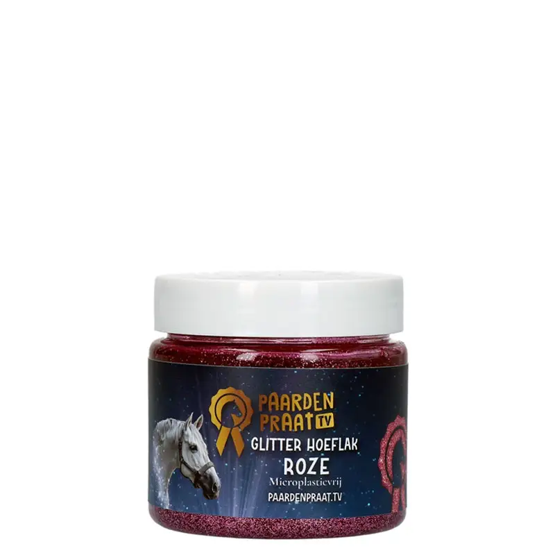 Paardenpraat Glitter Hoeflak Roze. Laat de hoeven van je paard of pony glitteren zoals nooit tevoren. Ideaal voor gebuik bij fotoshoots of speciale gelegenheden.