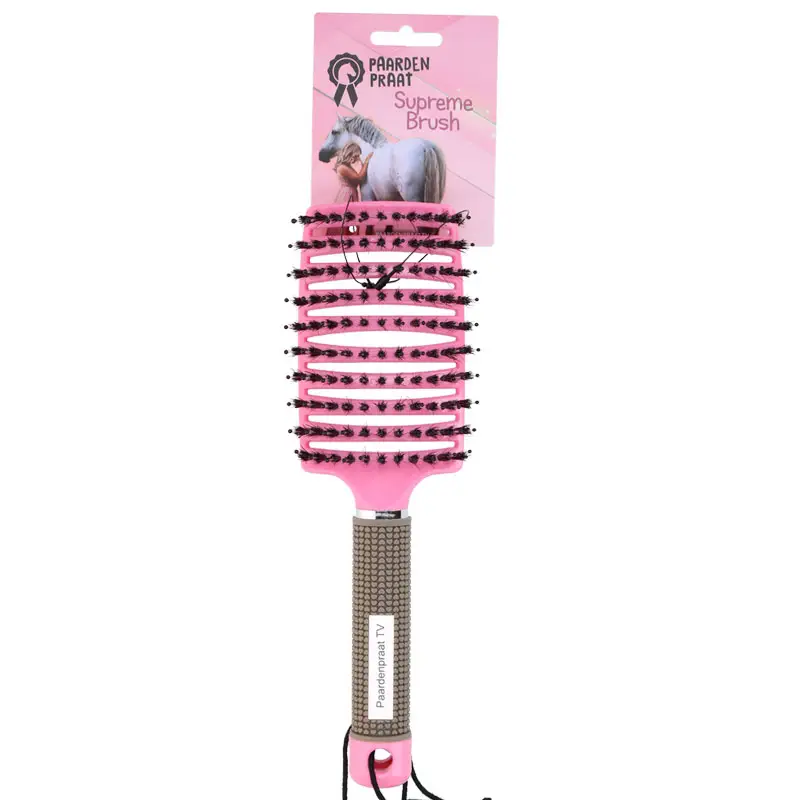 Met de Paardenpraat Horse Supreme Borstel verwijder je gemakkelijk alle klitten uit de staart en manen van je paard. Tevens voorkomt de borstel gespleten haarpunten. De borstel is gemaakt uit varkensharen in combinatie met flexibele pinnen met een zachte soft-top. Deze combinatie draagt er zorg voor dat de borstel gemakkelijk door het haar gehaald kan worden, zonder dat er haren uit worden getrokken. Het handvat van de borstel ligt comfortabel in de hand vanwege de rubberen soft handgreep en de polslus zorgt ervoor dat deze niet zomaar uit de handen valt, waardoor het paard zou kunnen schrikken.
