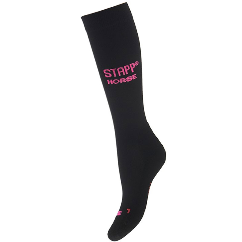 Paardrijsokken Stapp Horse Deocell Zwart/Pink gemaakt uit vormvaste en vochtregulerende polyamide. De kniekous is effen gekleurd en heeft een Stapp Horse logo in contrast kleur. De kniekous is afgewerkt met comfortabele platte naden.