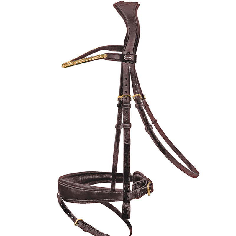 Het Passier hoofdstel Favorite havanna is mede ontworpen door Ingrid Klimke. Het hoofdstel is voorzien van een zacht gevoerd anatomisch gevormd terug gesneden kopstuk zodat het paard nauwelijks druk achter de oren krijgt. Dit kopstuk draagt zorg voor optimaal comfort en drukverlichting op de nek van het paard. De speciale anatomisch gevormde neusriem is evenals het kopstuk zacht gevoerd en draagt zorg voor een optimaal comfort. De gebogen frontriem van dit hoofdstel is afgewerkt met Premium Crystal steentjes in de kleur Smoke Topaz. Het hoofdstel wordt geleverd inclusief bijpassende teugels.