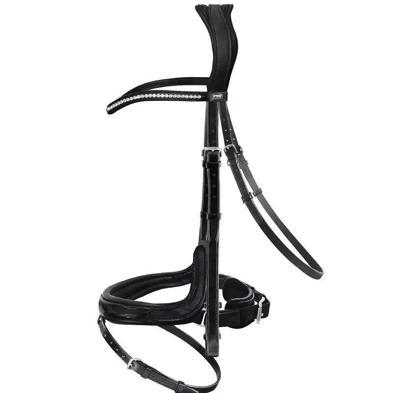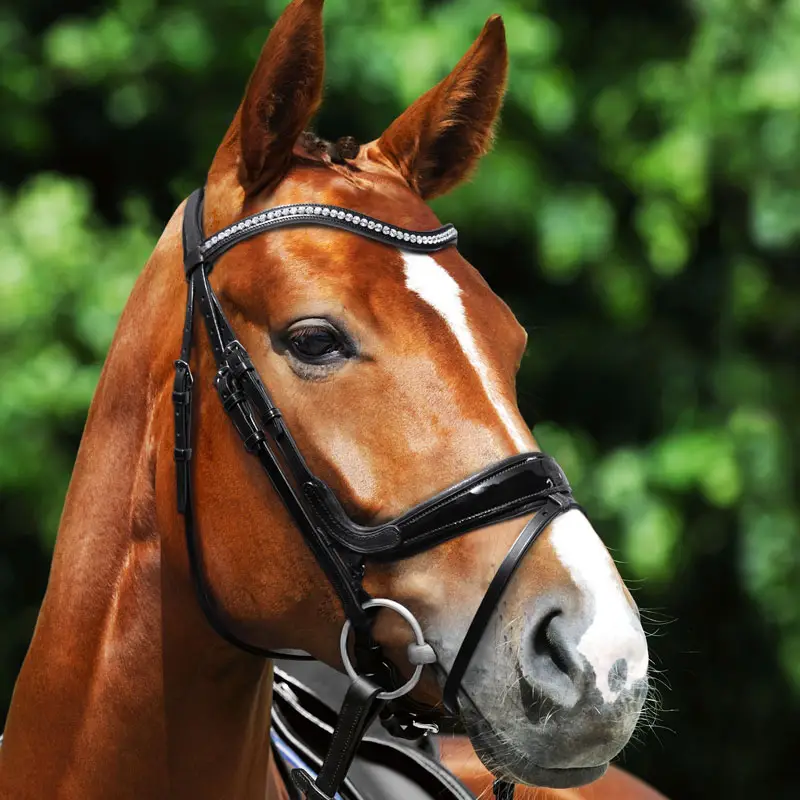 Dit schitterende Passier hoofdstel Starlight is ontworpen met een anatomisch gevormd zacht onderlegd kopstuk welke zorgt draagt voor optimaal comfort en drukverlichting op de nek van het paard. De glanzende lak lederen neusriem is tevens zacht onderlegd en biedt vrijheid bij het jukbeen en bij de oogzenuw. Het golvende model frontriem is afgewerkt met Premium Crystal steentjes.