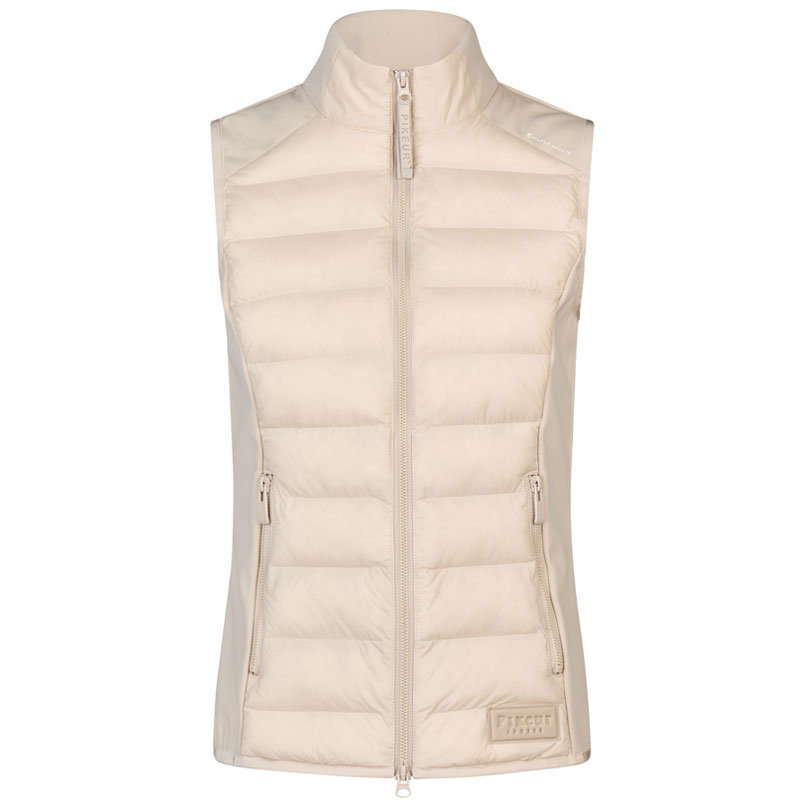 Pikeur Hybrid Bodywarmer 8003 Pale Grey. Elastische met velvety warm gevoerde dames bodywarmer voorzien van opstaande kraag, tweeweg ritssluiting en zakken met ritssluitingen. De bodywarmer is afgewerkt met Pikeur logo op de linker onderzijde en print op de linker schouder.