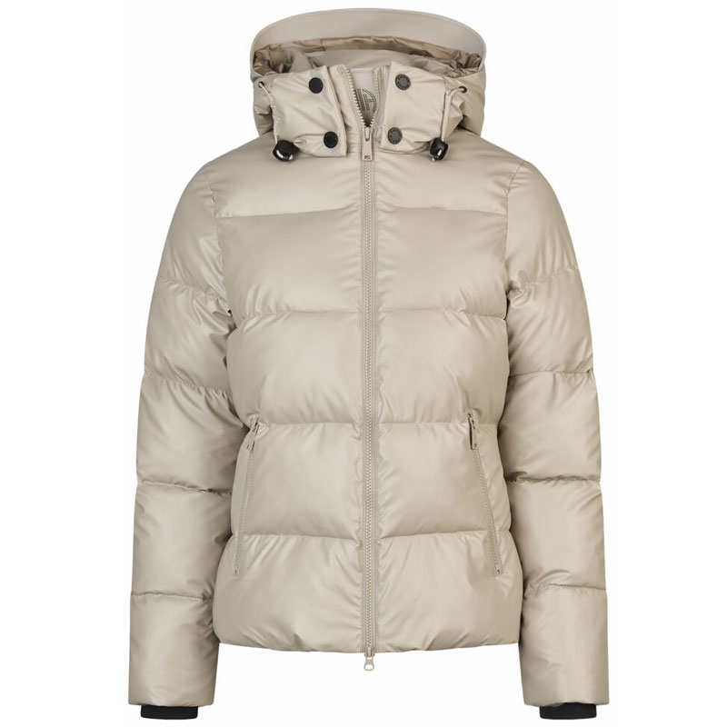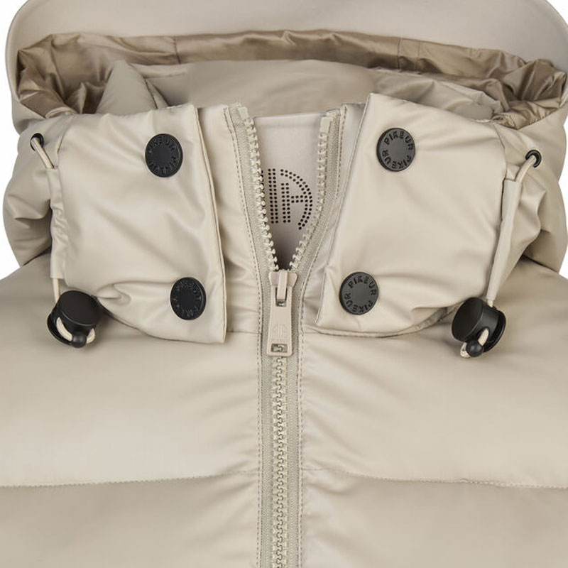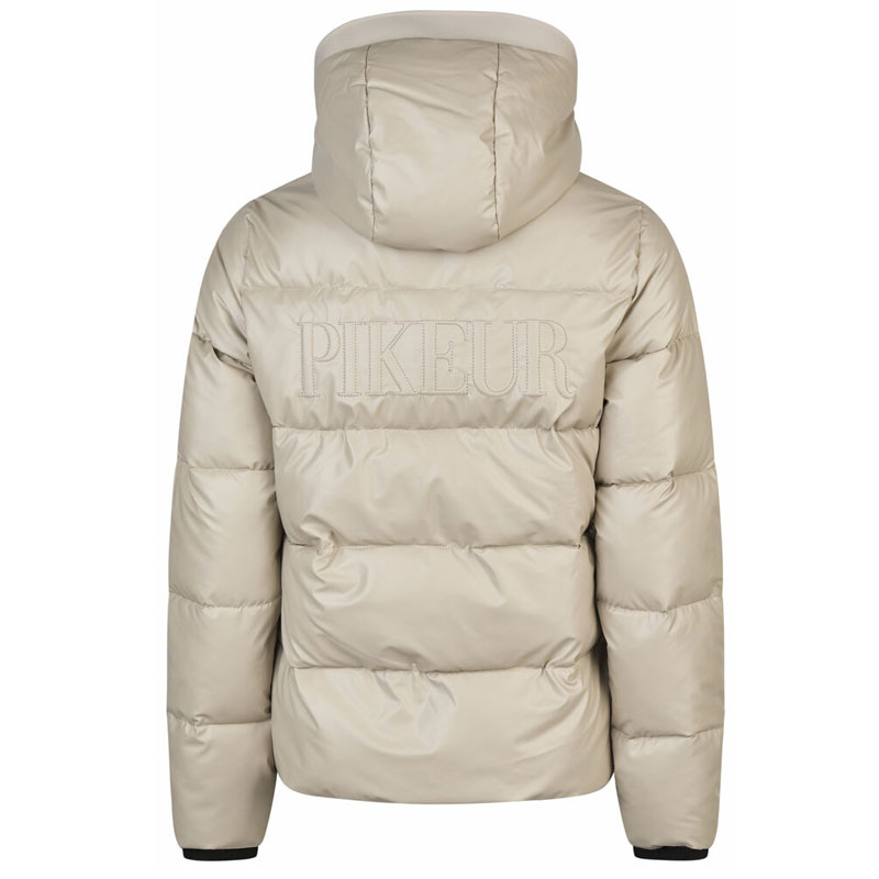 Pikeur Jas 8023 Almond. Heerlijke met warmte regulerende Fibreball gevoerde winterjas voor dames uit de Pikeur Athelisure collectie met afneembare capuchon, tweeweg ritssluiting, zakken met ritssluitingen en een afwerking met groot 3D geborduurd logo op de rug.