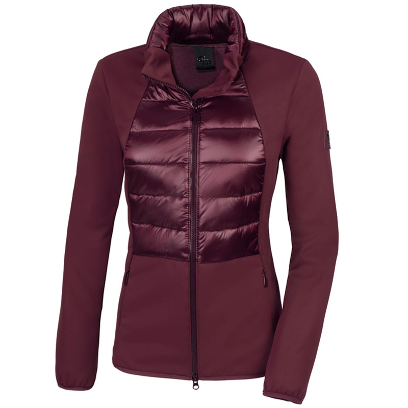 De Pikeur Jas Hybrid 4047 Selection Mulberry is gemaakt uit wind en waterafstotende softshell in combinatie met gewatteerd gedeelte op het lichaam. Het materiaal is elastisch en aan de binnenzijde met teddy fleece gevoerd. De jas is voorzien van een tweeweg ritssluiting, zakken met ritssluitingen en is afgewerkt met elegante Strass applicatie op de achterzijde en Pikeur logo op de linker mouw.