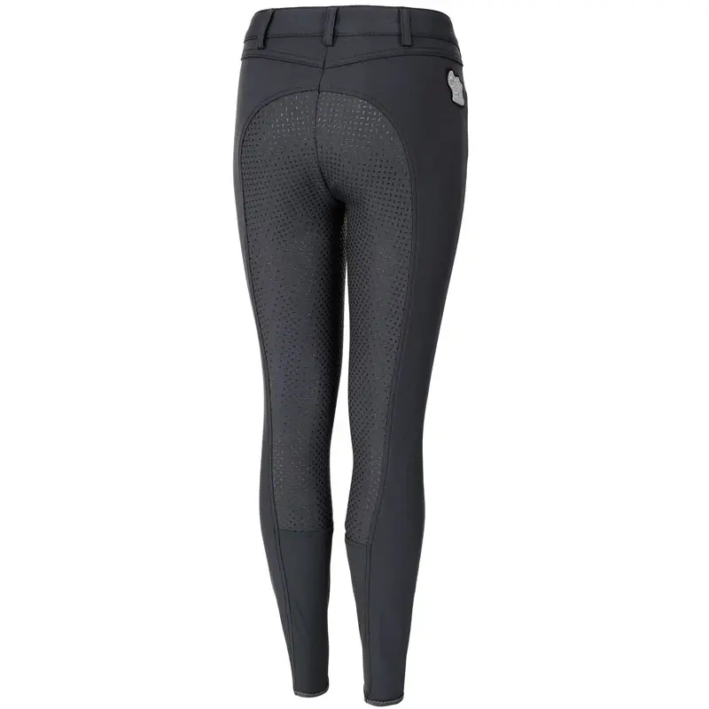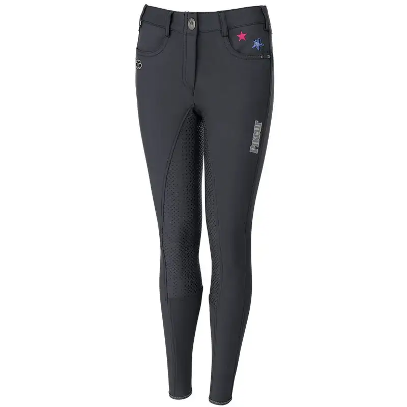 Fraai uitziende kinder paardrijbroek van het merk Pikeur door de afwerking van diverse applicaties. De Pikeur kinder paardrijbroek Kalotta Batch Grip kids is voorzien van jeanspockets aan de voorzijde, een polyurethaan Grip zitvlak en elastisch gedeelte bij de enkels.