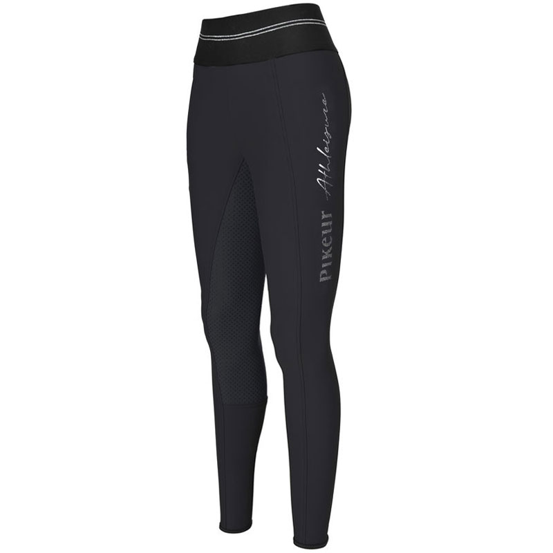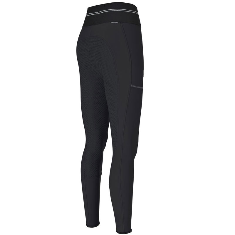 De hype van dit moment zijn de Pull On model rijbroeken ook wel rijleggings genoemd. De Pikeur rijbroek Gia Grip is voorzien van een brede, elastische tailleband en heeft een Full Grip zitvlak gemaakt uit polyurethaan. De rijbroek heeft een mobiele telefoonzak op het rechter been en is afgewerkt met Pikeur applicatie vervaardigd uit glitter materiaal op het linker been.