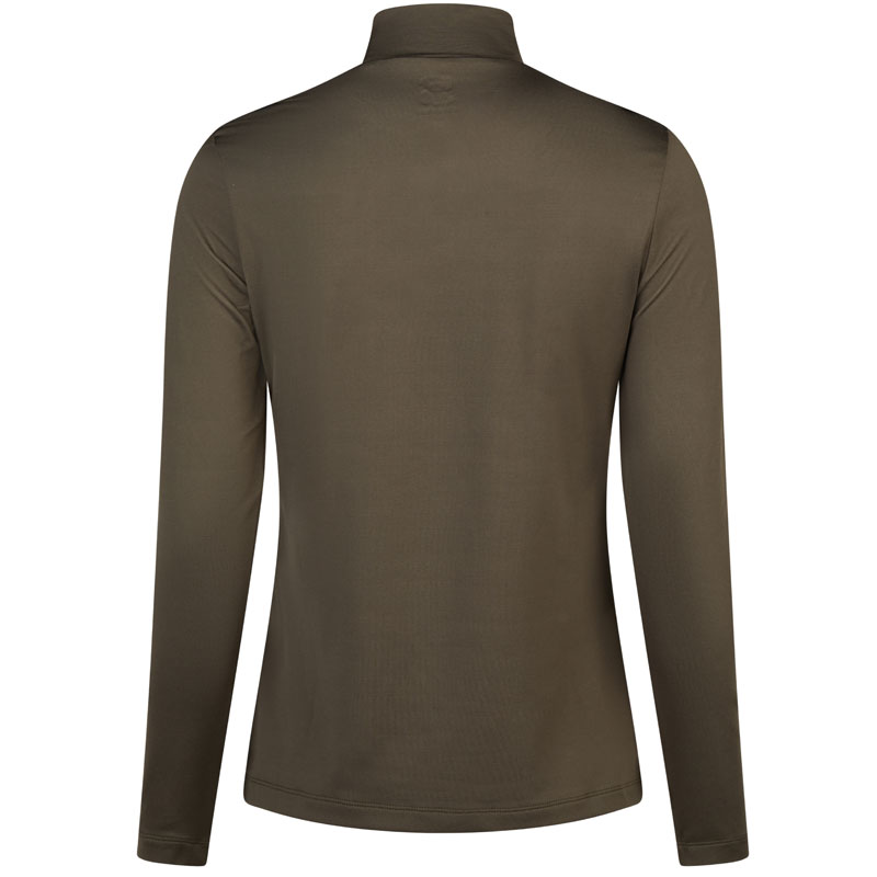 Pikeur Strass Shirt 8273 Deep Khaki is een functioneel dames shirt voorzien van kort opstaand boordje, lange mouwen en een afwerking met strass steentjes onder de boord aan de voorzijde en aan het uiteinde van de linker mouw.