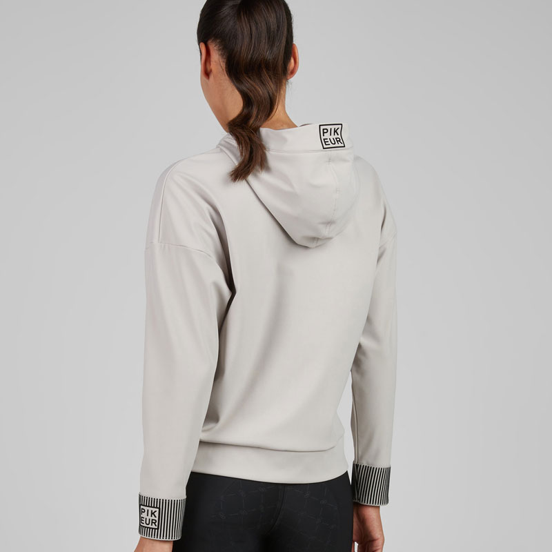 Pikeur Sweater 8281 Pale Grey. Functionele, comfortabele dames sweater met capuchon en een heerlijke warme geborstelde fleece binnenzijde. Het sweater heeft een rechte standaard pasvorm wat zorg draagt voor een oversized look. Afgewerkt met logo in combinatie met strass op de borst, logo op het uiteinde van de mouw en op de rand van de capuchon.