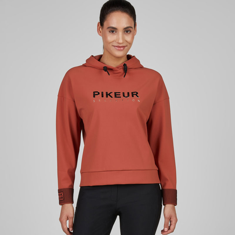 Pikeur Sweater 8281 Rose Wood. Functionele, comfortabele dames sweater met capuchon en een heerlijke warme geborstelde fleece binnenzijde. Het sweater heeft een rechte standaard pasvorm wat zorg draagt voor een oversized look. Afgewerkt met glitter logo omlijnd met een rosegoud randje op de borst, logo op het uiteinde van de mouw en op de rand van de capuchon.