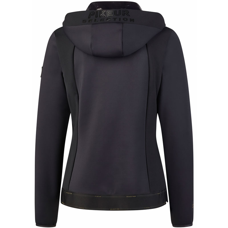 Pikeur Techjersey Vest 7045 Selection Zwart voor dames is uitgevoerd met een vaste capuchon, tweeweg ritssluiting en zakken met ritssluitingen. Het vest is gemaakt uit een antistatiche, lichtgewicht stof gecombineerd met een elastische ribstop. Het vest is afgewerkt met Pikeur labeling op de rand van de capuchon en Selection logo op de linker mouw.