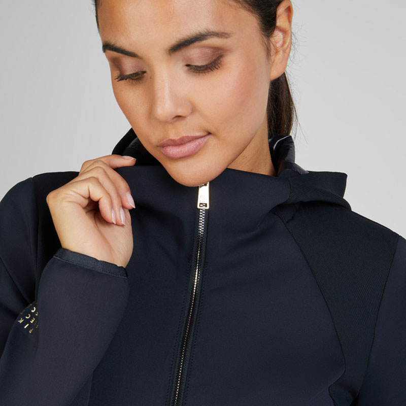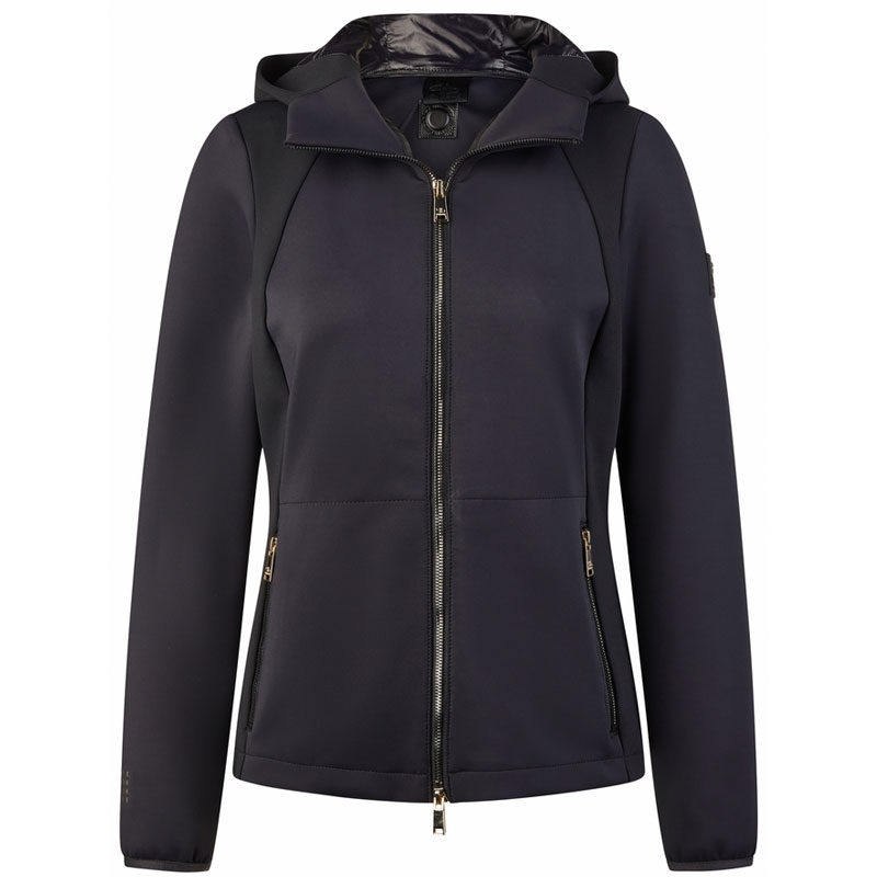 Pikeur Techjersey Vest 7045 Selection Zwart voor dames is uitgevoerd met een vaste capuchon, tweeweg ritssluiting en zakken met ritssluitingen. Het vest is gemaakt uit een antistatiche, lichtgewicht stof gecombineerd met een elastische ribstop. Het vest is afgewerkt met Pikeur labeling op de rand van de capuchon en Selection logo op de linker mouw.