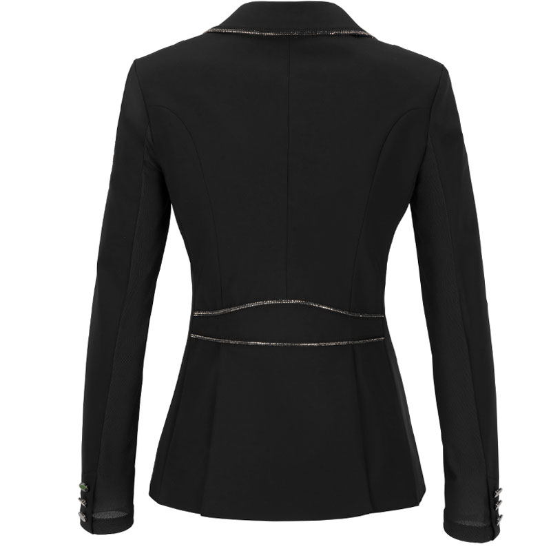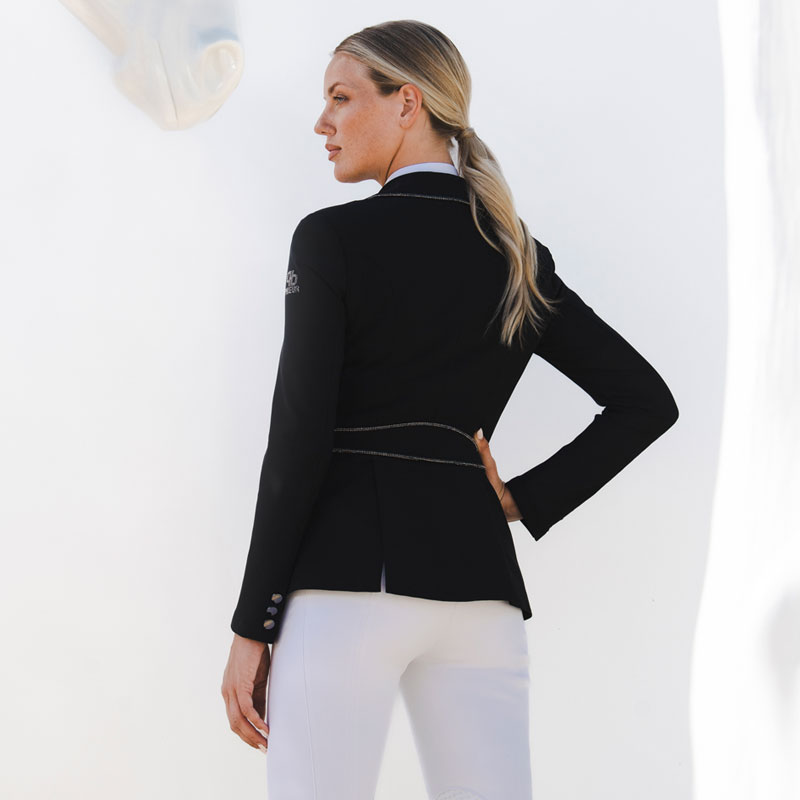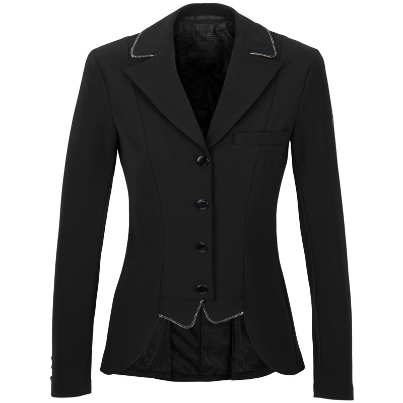 De Pikeur wedstrijdjas Cecile is een hoogwaardig kwaliteit wedstrijdjasje voor dames gemaakt uit technische Jersey stof met mesh gedeelte onder de armen. De voorzijde van het jasje is kort uit gesneden met een langere snit aan de achterzijde. Met het smalle borstzakje en de afwerking van steentjes op zowel de kraag, achterzijde als op de punt boordjes aan de voorzijde draagt zorg voor een exclusieve look.