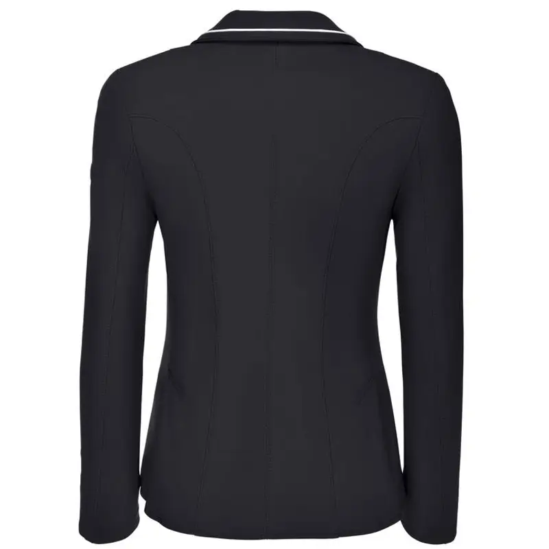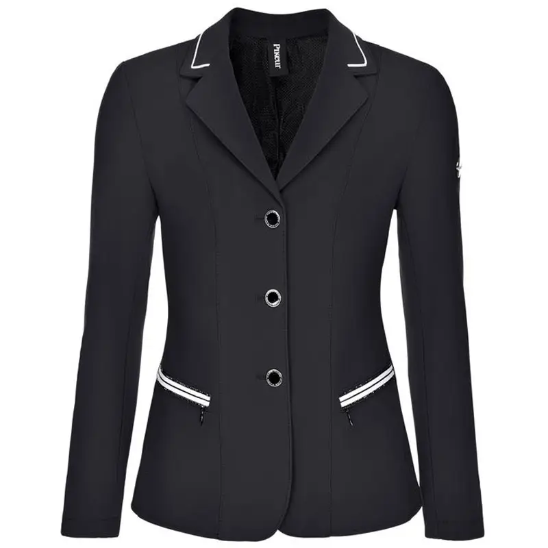Getailleerd, slank model rijjasje vervaardigd uit hoogwaardige en comfortable Pikeur softshell kwaliteit. Het jasje is voorzien van zakken met verborgen ritssluitingen afgewerkt met contrasterende pipings en strass steentjes op zowel de boven- als onderzijde. Achter de knoopsluiting bevindt zicht tevens een ritssluiting en de kraag is evenals de zakken voorzien van contrasterende piping. De achterzijde van het jasje is voorzien van een dubbele rijsplit.