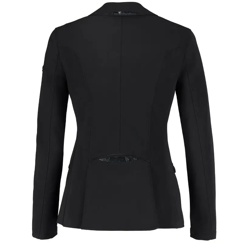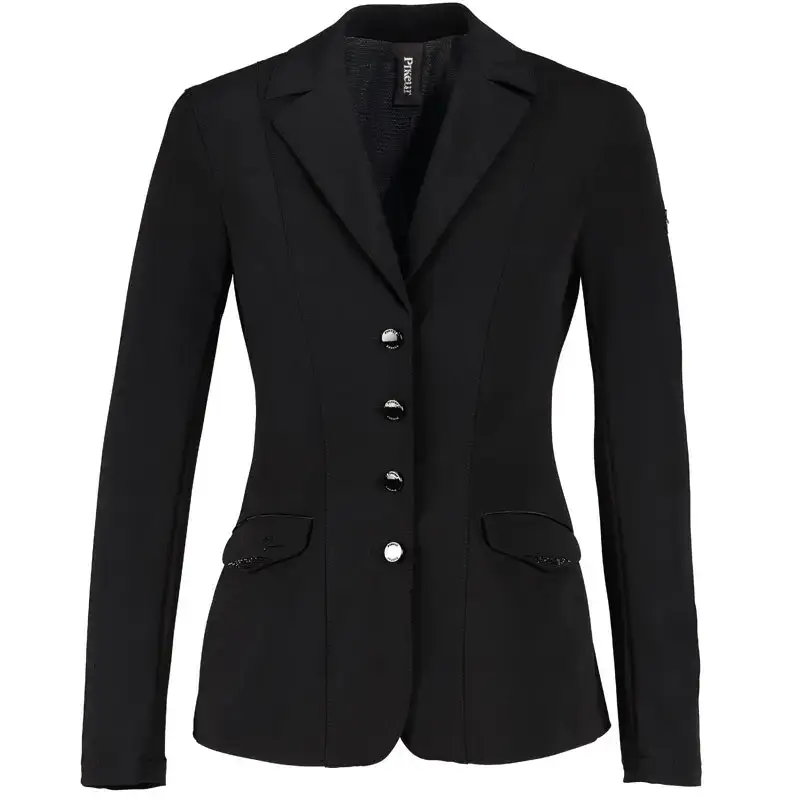 Het Pikeur rijjasje Isalie zwart is gemaakt uit hoogwaardige kwaliteit ademende softshell. Het wedstrijdjasje is elastisch en heeft een slanke pasvorm. Het jasje is voorzien van klepzakjes afgewerkt met schitterende strass steentjes op de voorzijde en heeft een dubbele split met strass steentjes op de achterzijde. Het jasje is licht in gewicht en heeft een luchtige mesh voering.
