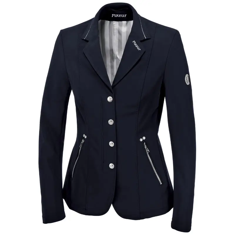 Exclusieve, hoogwaardige kwaliteit dames wedstrijdjas Quibelle uit de Pikeur Premium zomercollectie. Het rijjasje heeft een hoog draagcomfort door de elastische stof en is afgewerkt met glimmende stiksels, zakken met ritssluitingen en Pikeur Premium embleem op de linker mouw. Het jasje heeft een dubbele split aan de achterzijde.