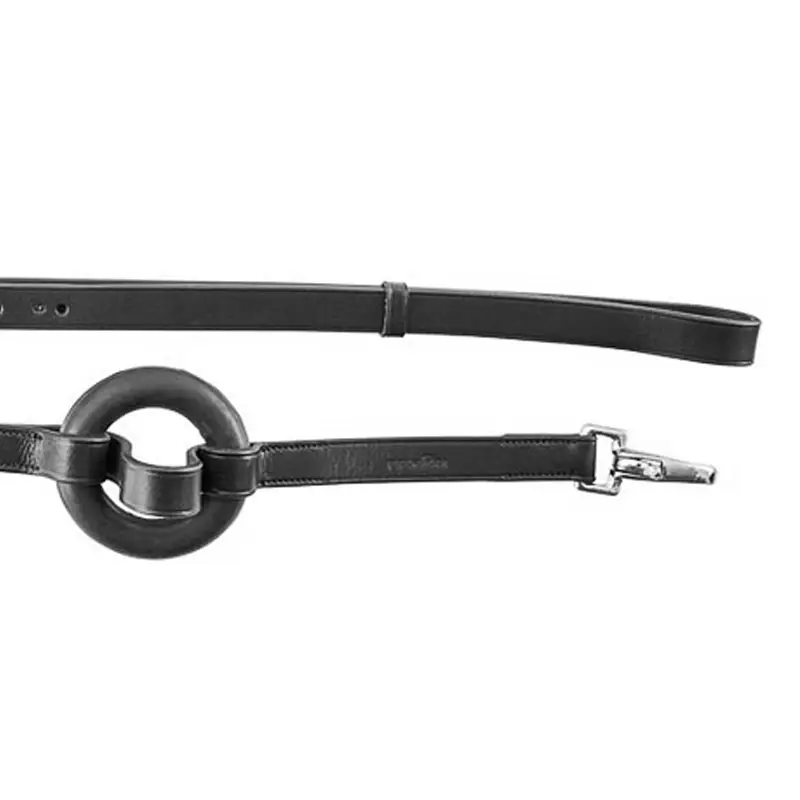 Premiere bijzetteugels Zwart gemaakt uit 19mm breed leer en voorzien van rubberen ring, zodat de teugel meegeeft als het paard beweegt.